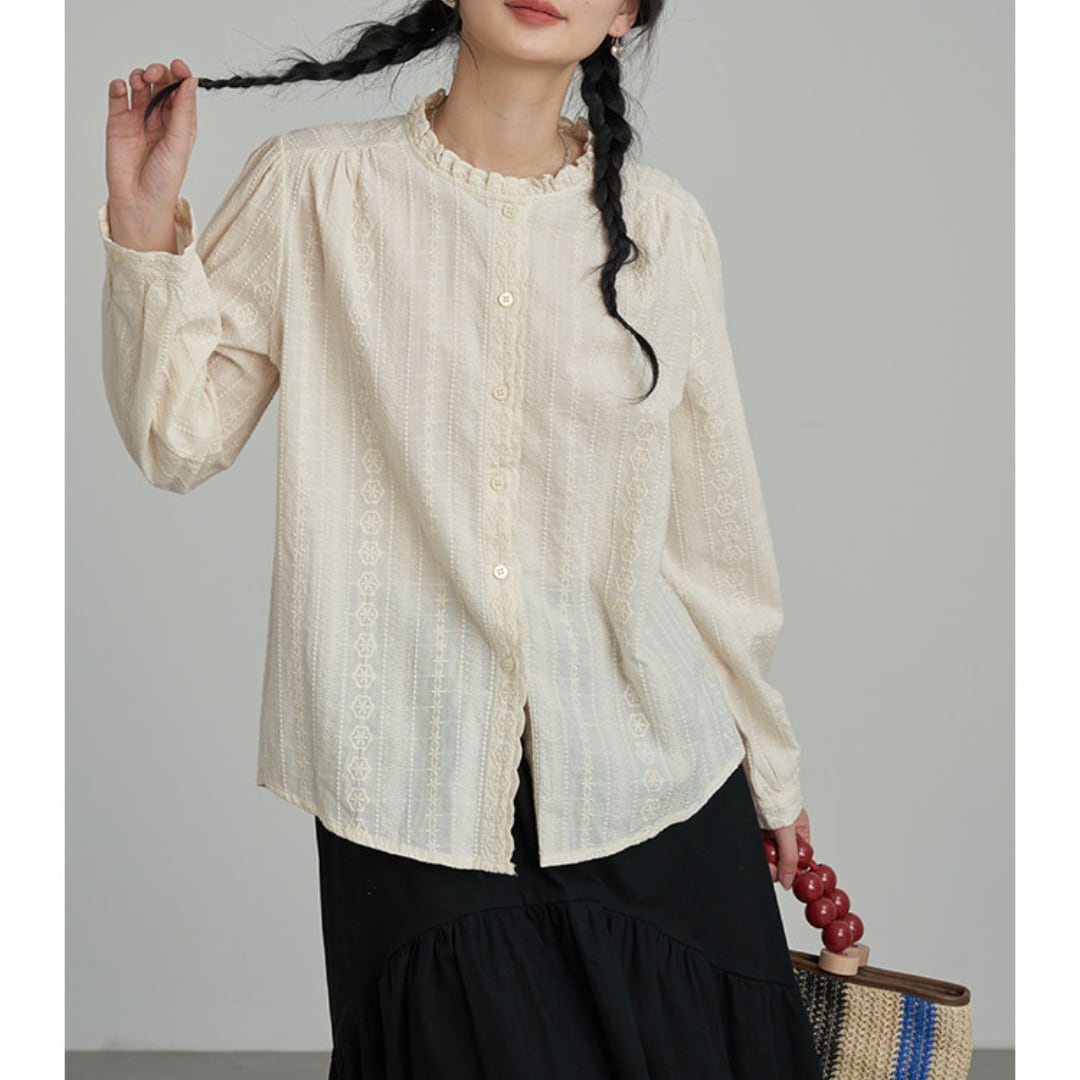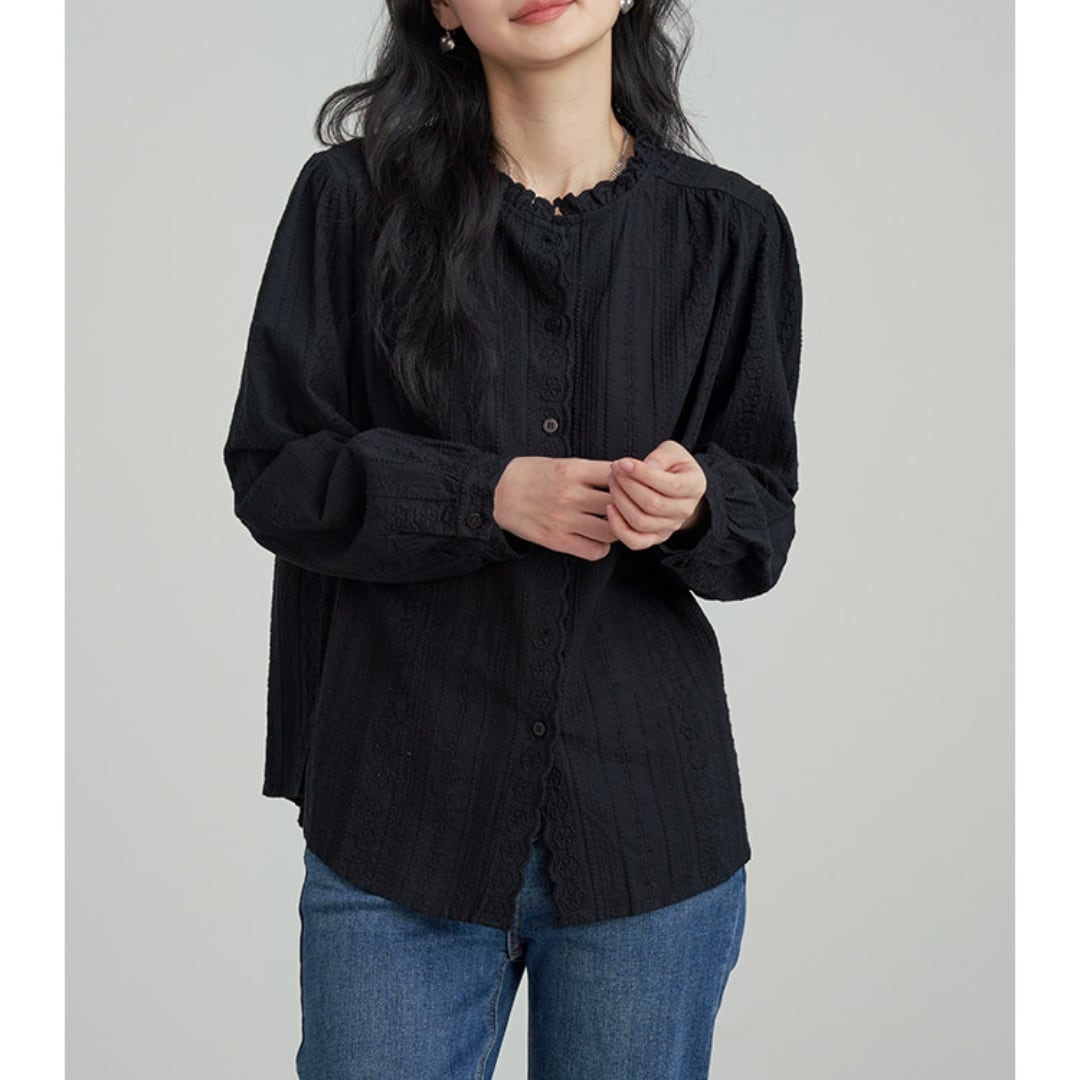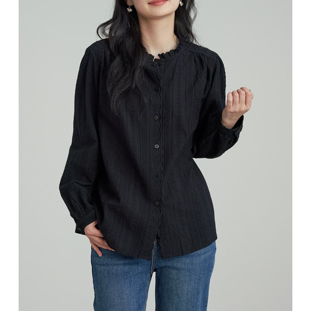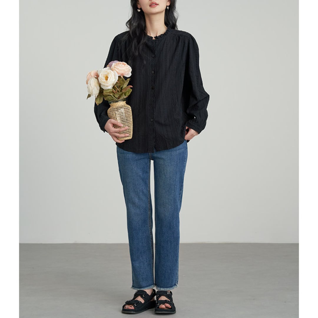 繊細なレースとフリルネックが印象的なデザインで、柔らかな風合いと程よくゆとりのあるシルエットが上品な雰囲気を演出するブラウス。
