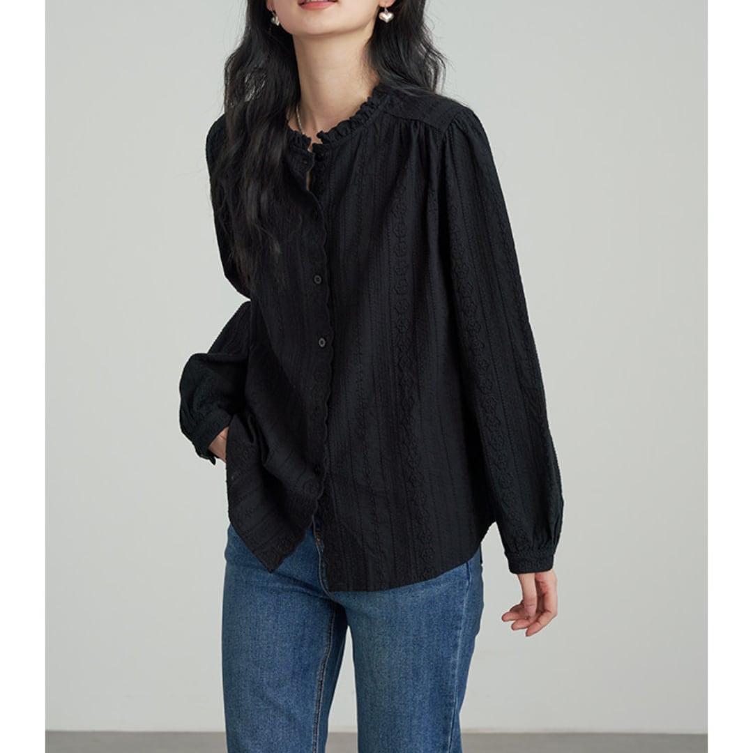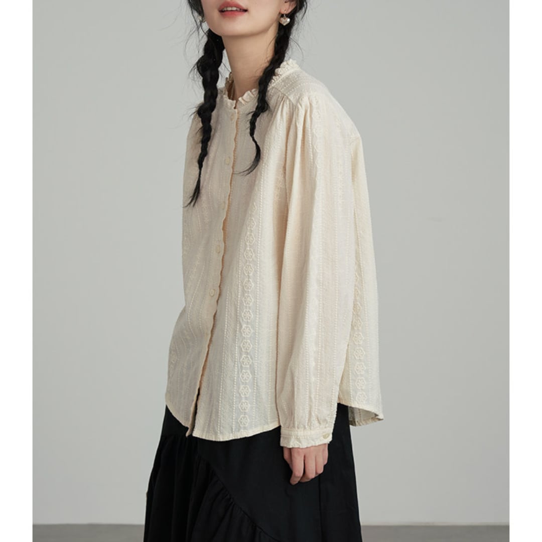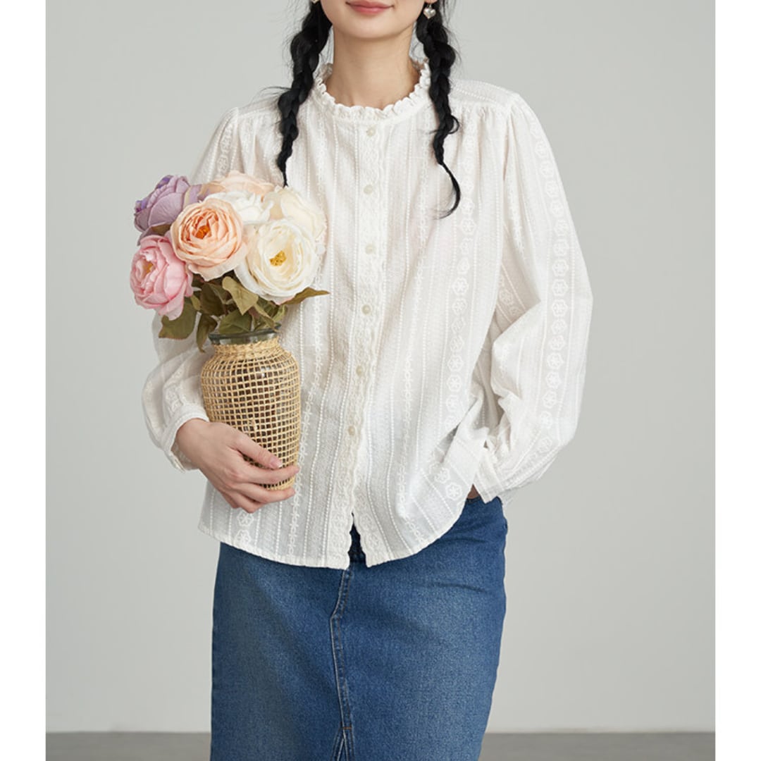 繊細なレースとフリルネックが印象的なデザインで、柔らかな風合いと程よくゆとりのあるシルエットが上品な雰囲気を演出するブラウス。