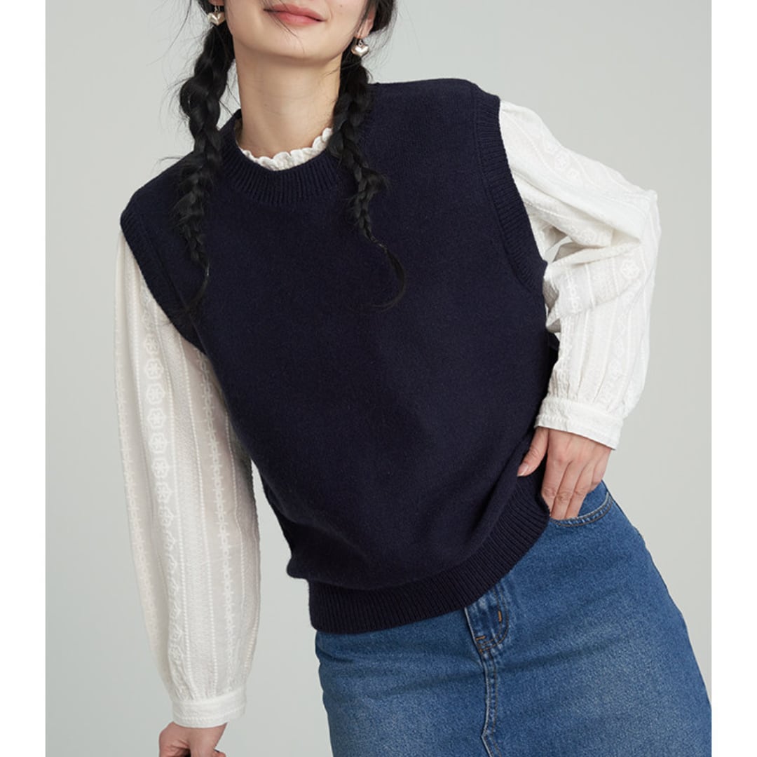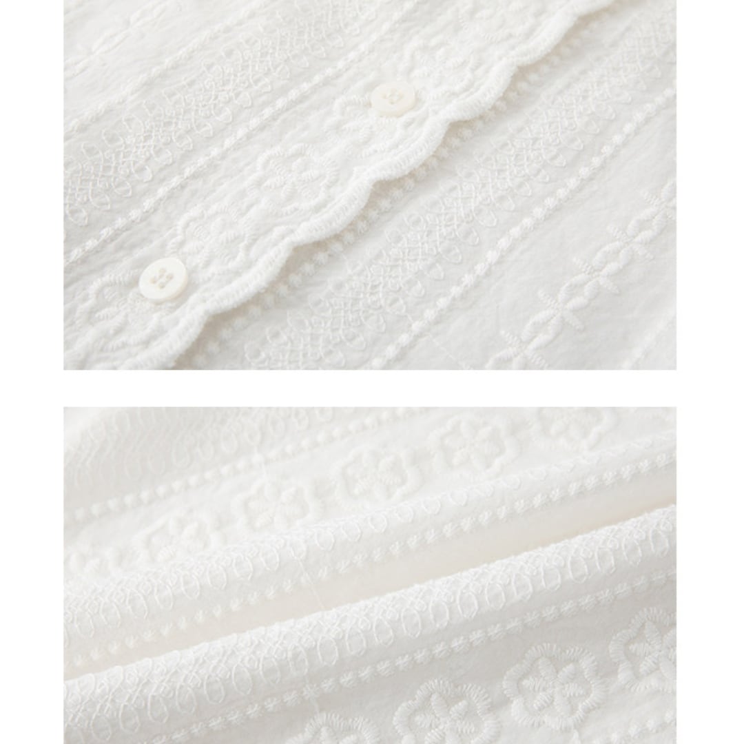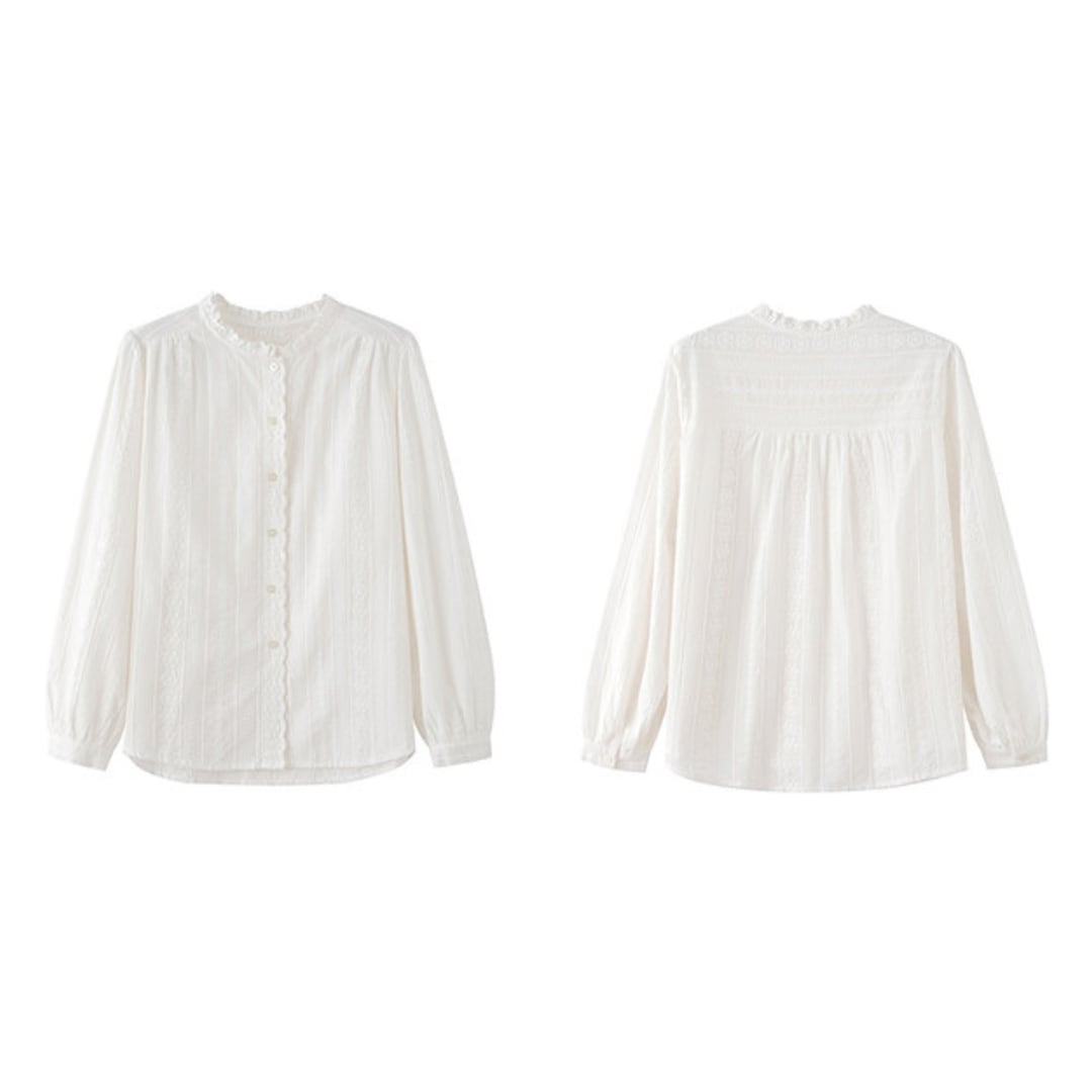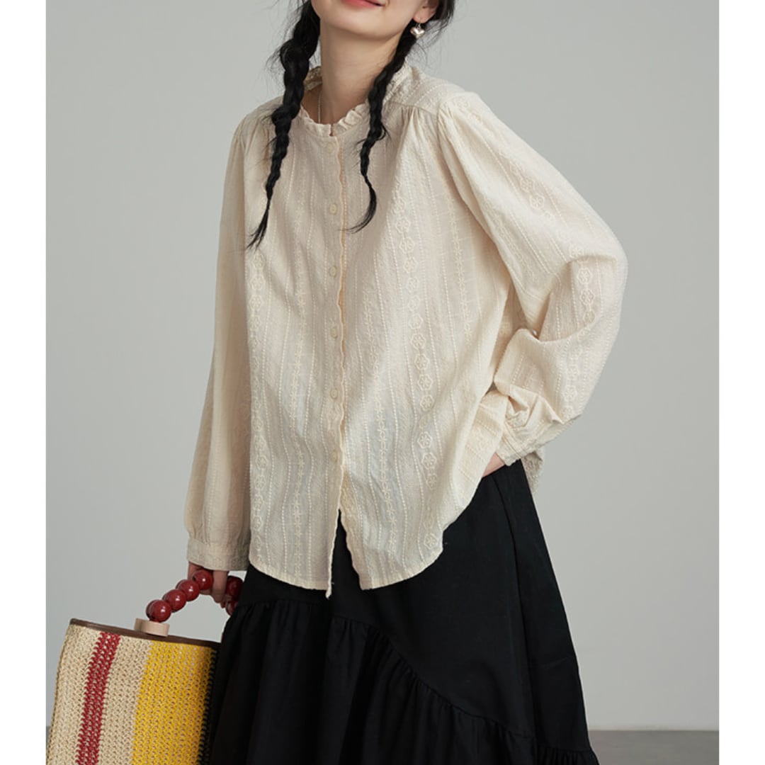 繊細なレースとフリルネックが印象的なデザインで、柔らかな風合いと程よくゆとりのあるシルエットが上品な雰囲気を演出するブラウス。