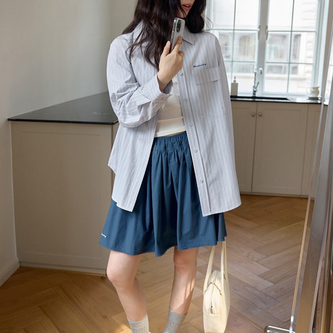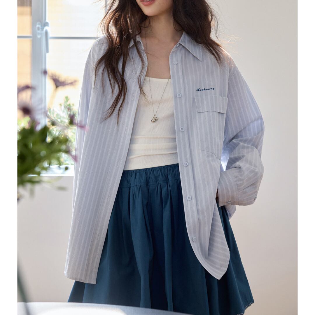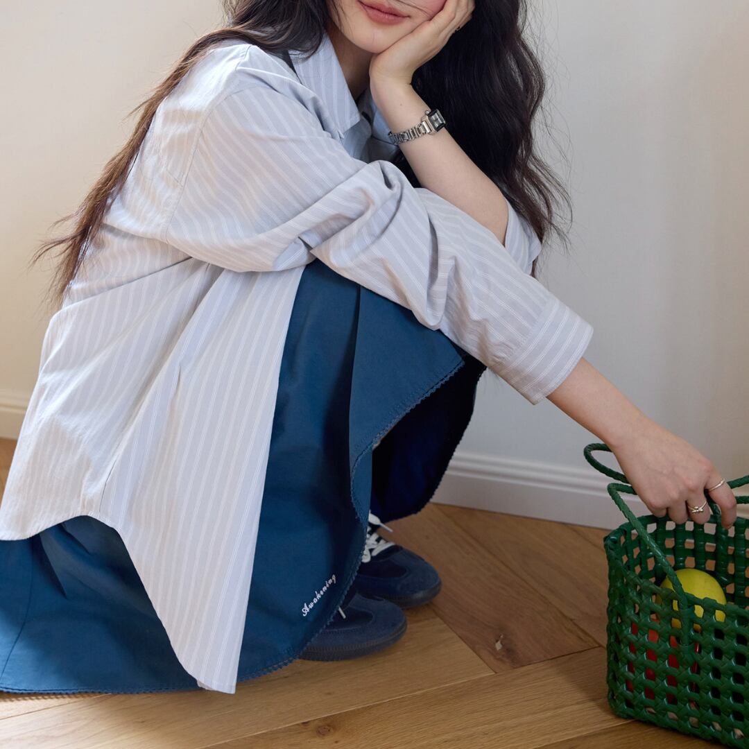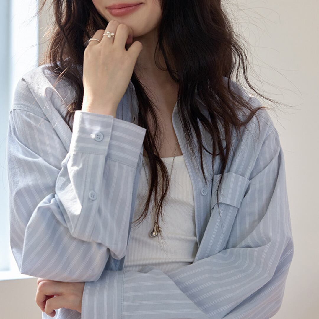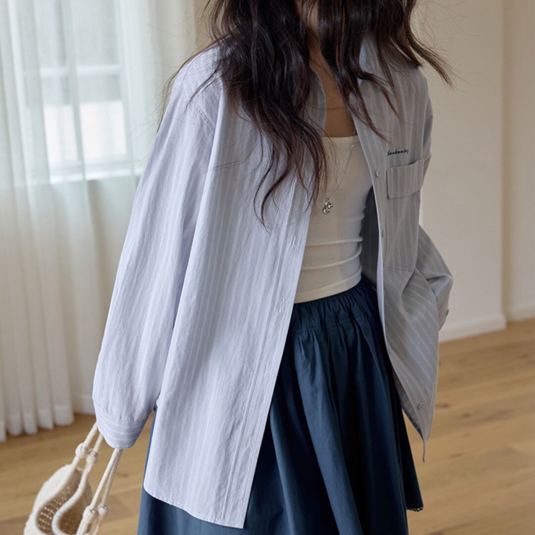 細めのストライプ柄とゆったりとしたシルエットが特徴のシャツは、シンプルながらも清潔感のある印象で、さりげなくこなれた雰囲気を演出します。