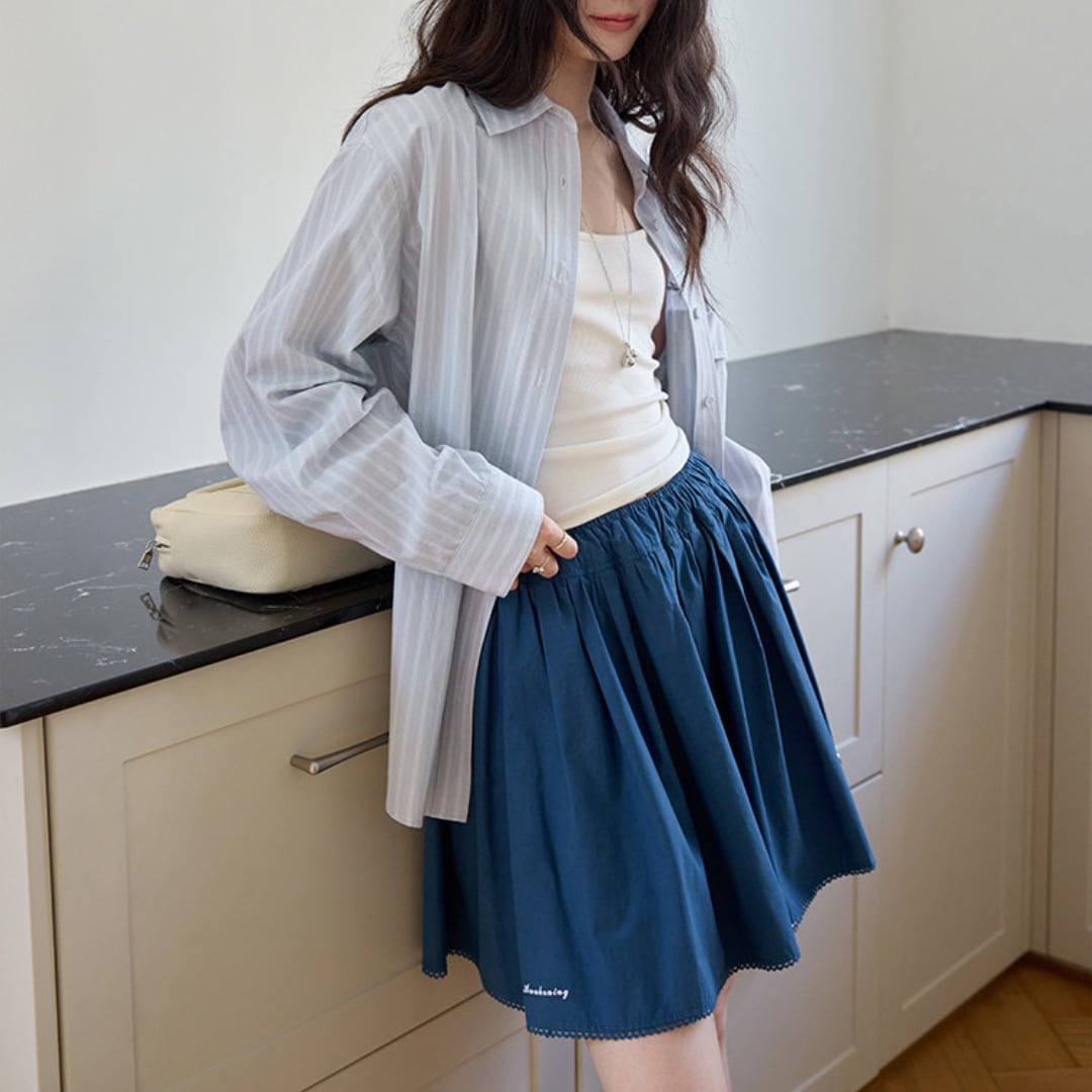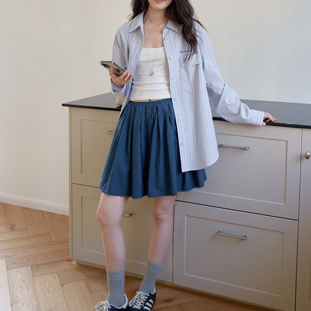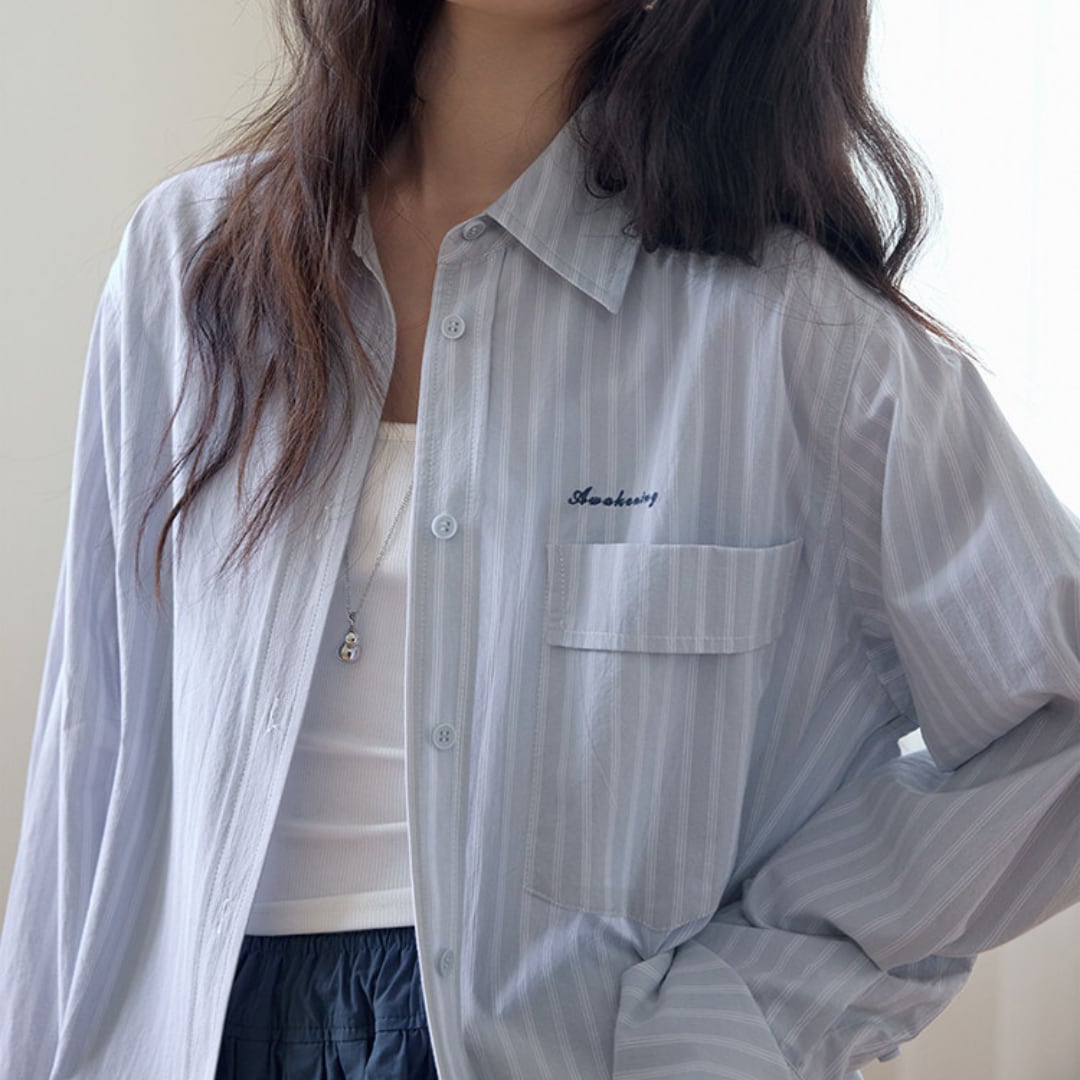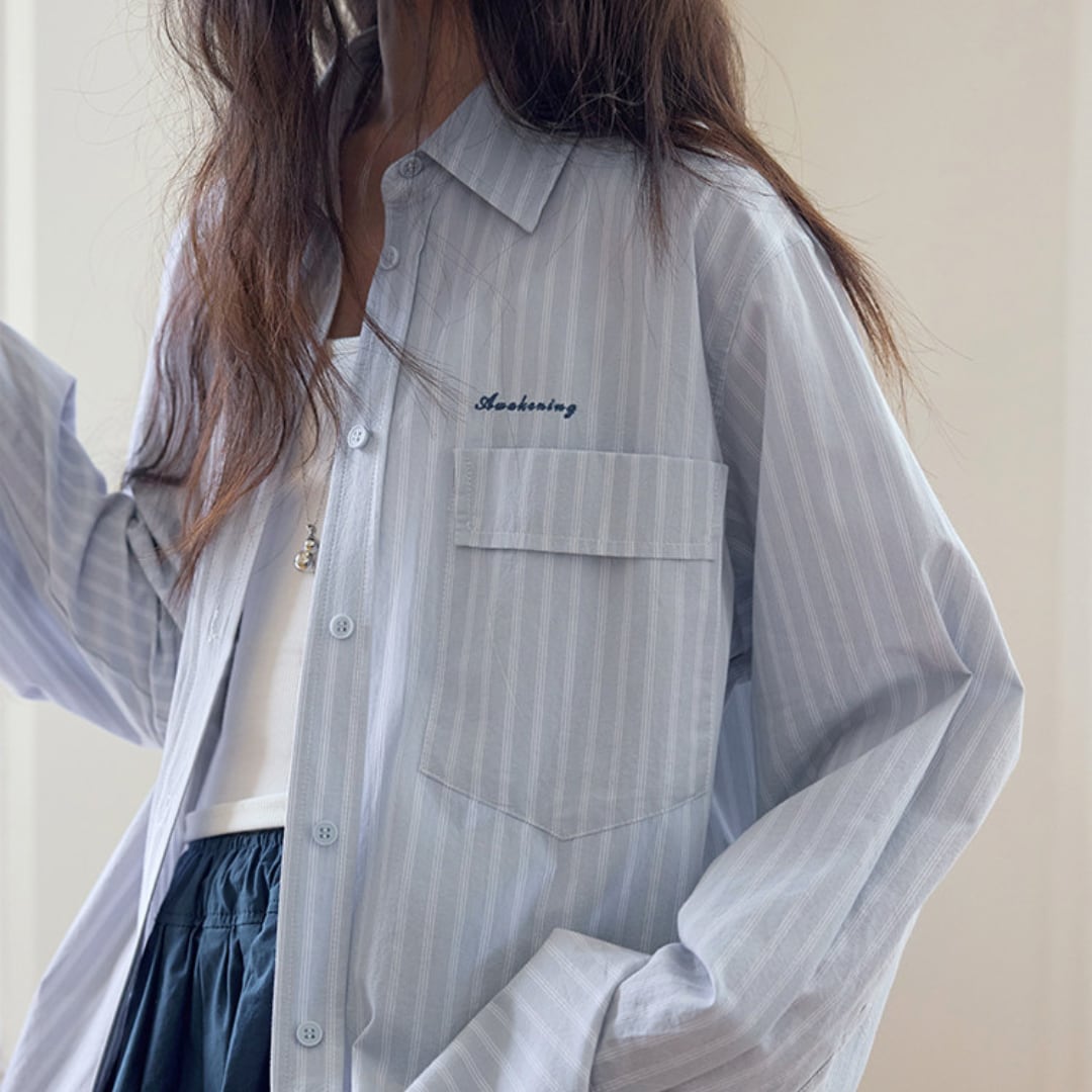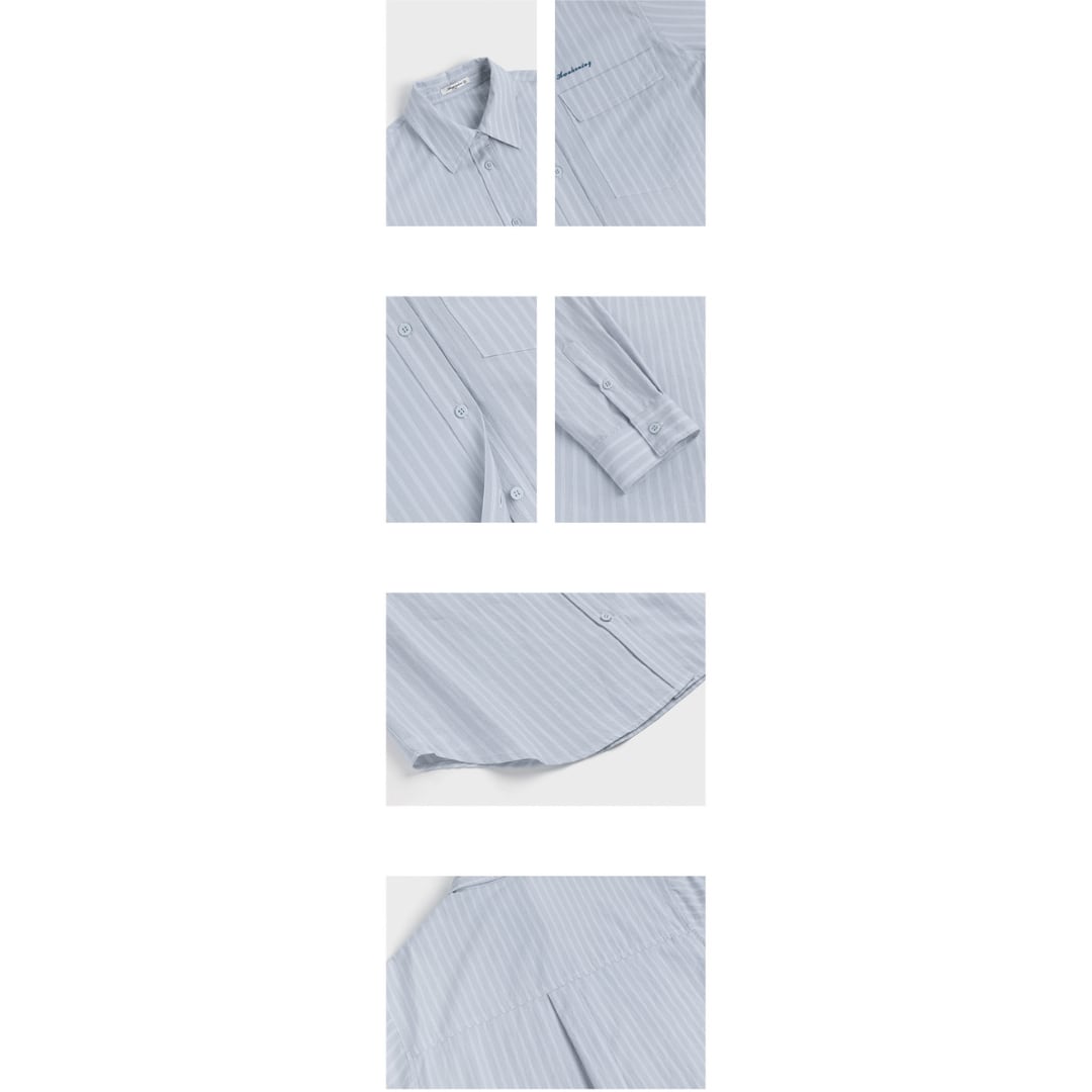細めのストライプ柄とゆったりとしたシルエットが特徴のシャツは、シンプルながらも清潔感のある印象で、さりげなくこなれた雰囲気を演出します。