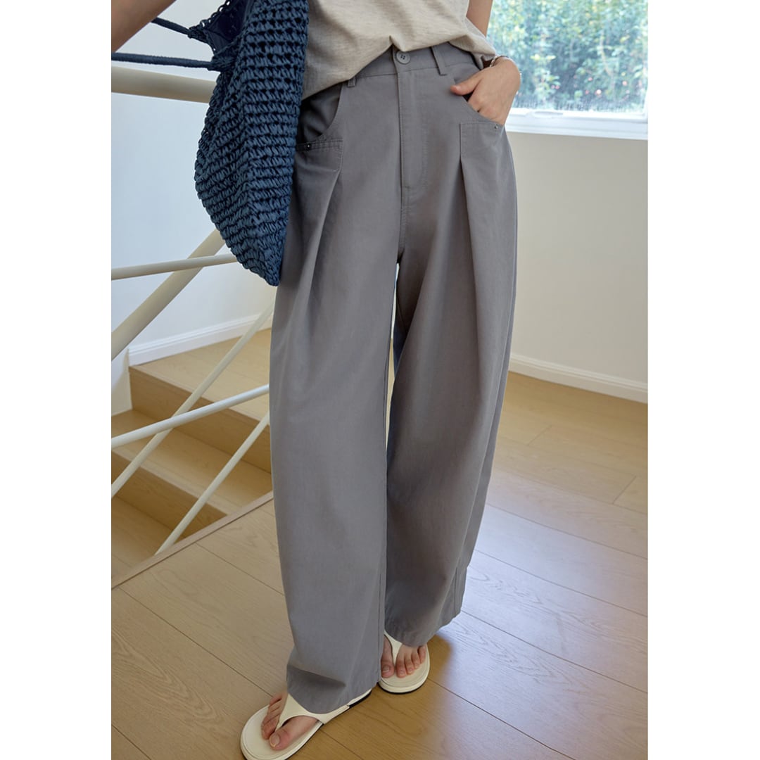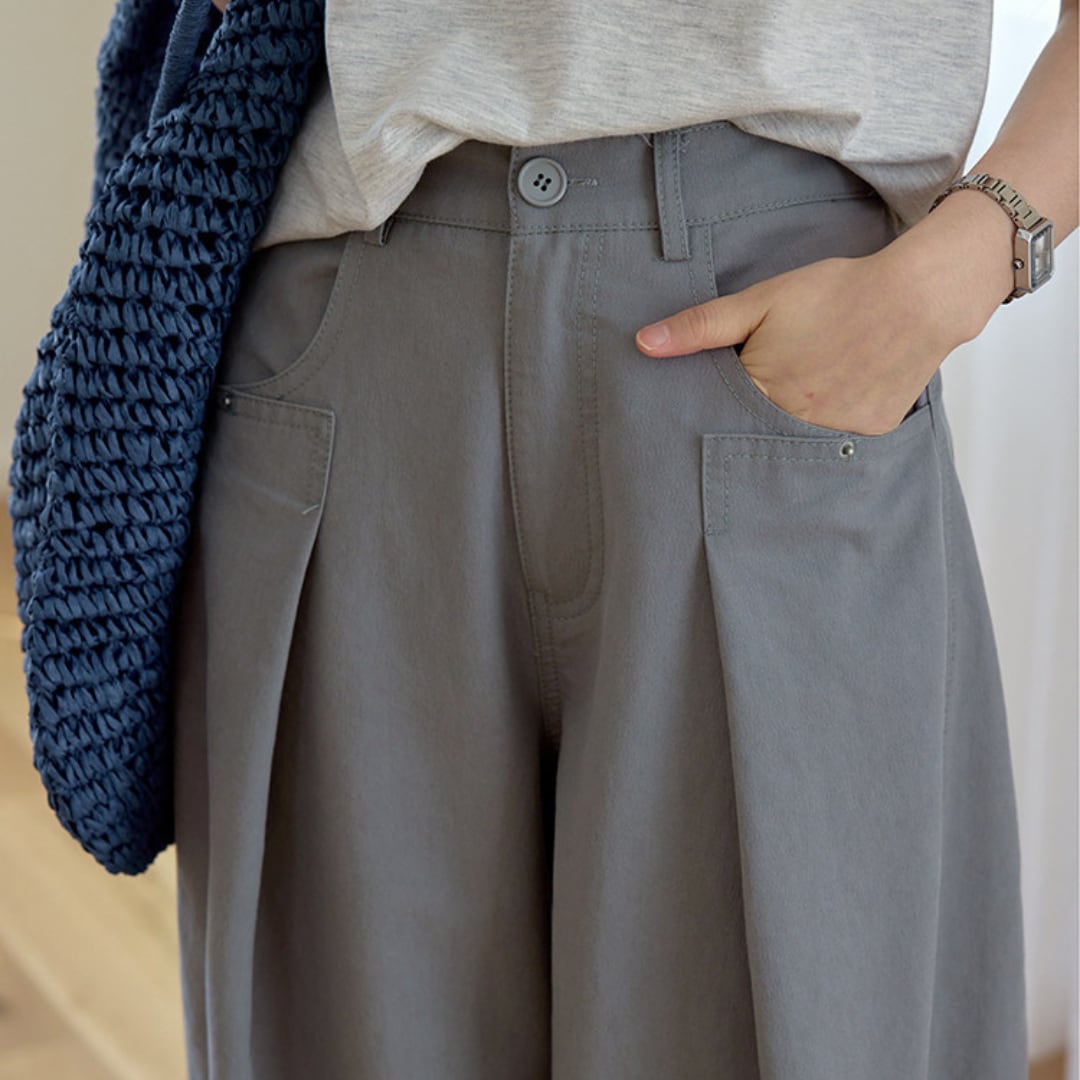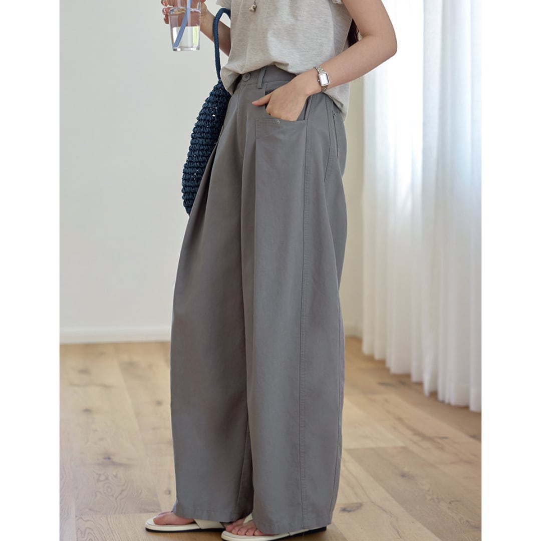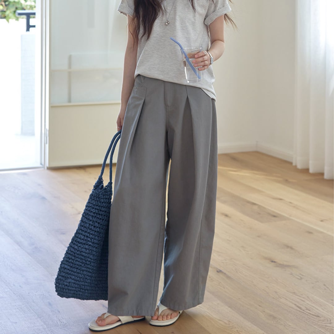 ゆったりとしたワイドシルエットが特徴のストレートパンツは、落ち感のあるラインで脚のラインを拾わず、リラックス感のある大人カジュアルな印象を演出します。