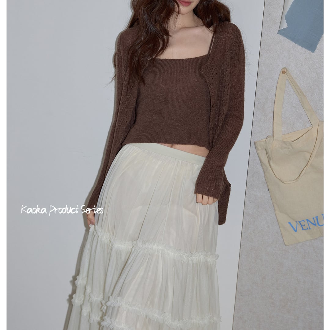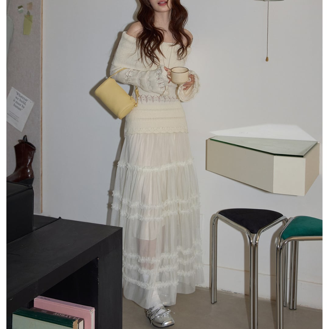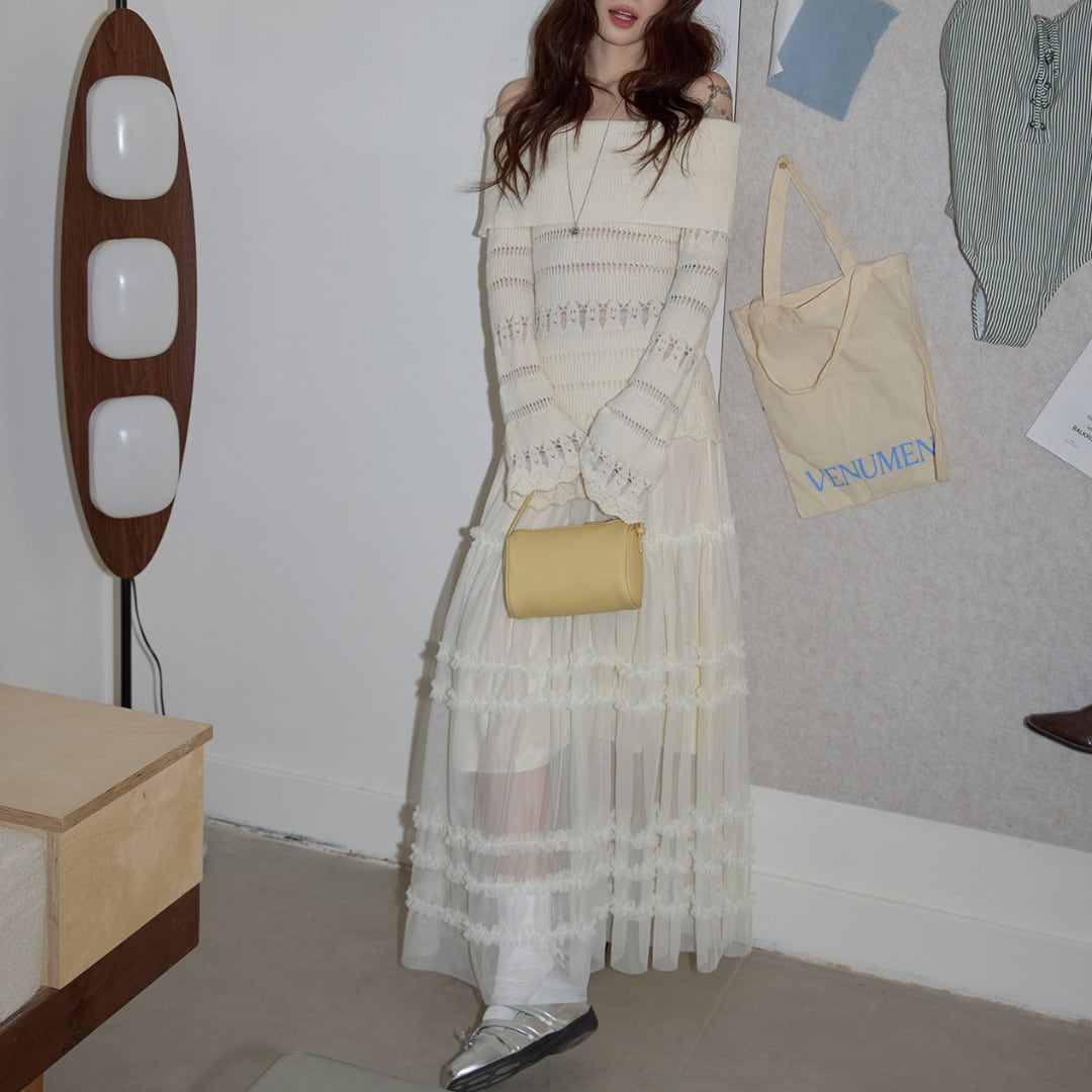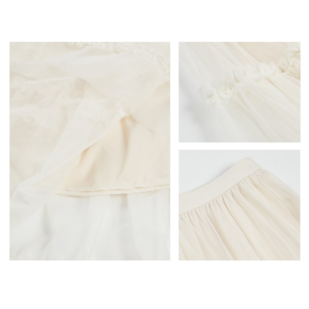 軽やかな素材感と段々に重なったティアードデザインが特徴のロングスカートは、ふんわりと広がるシルエットで動くたびにやさしく揺れ、女性らしい柔らかな印象を演出します。