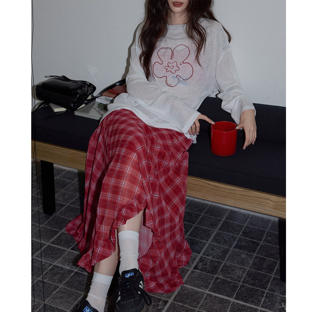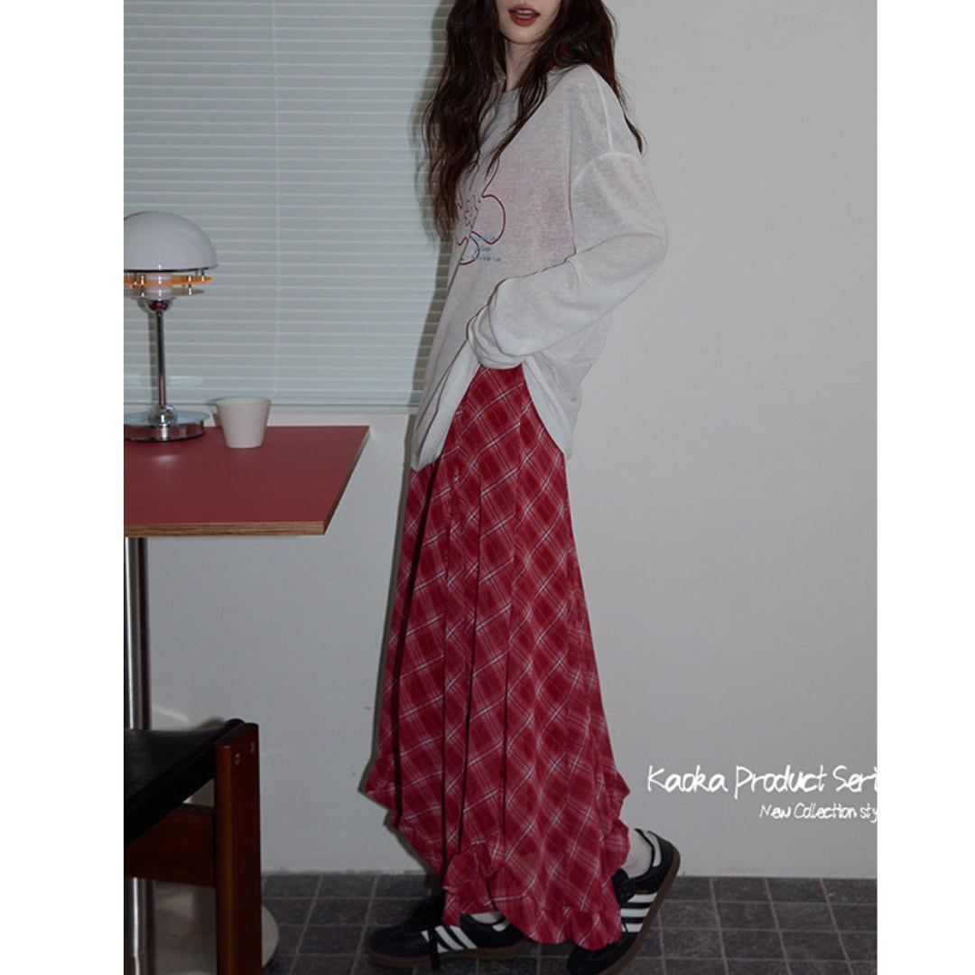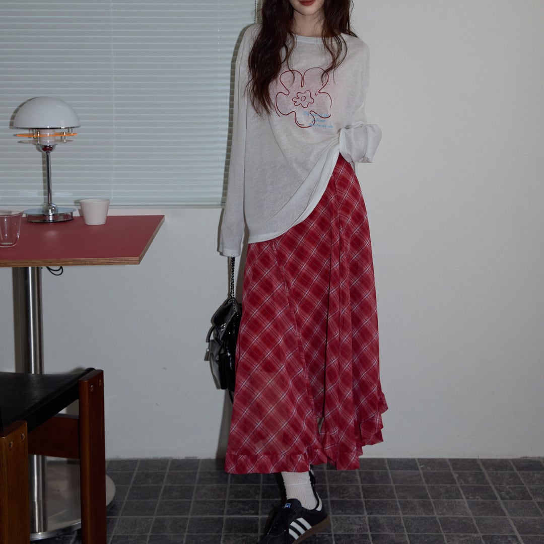 柔らかな揺れ感が魅力のフレアシルエットに、存在感のあるチェック柄を組み合わせたロングスカートは、コーディネートに華やかさと動きをプラスします。