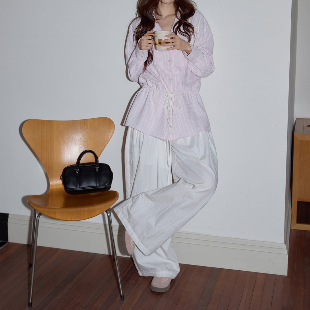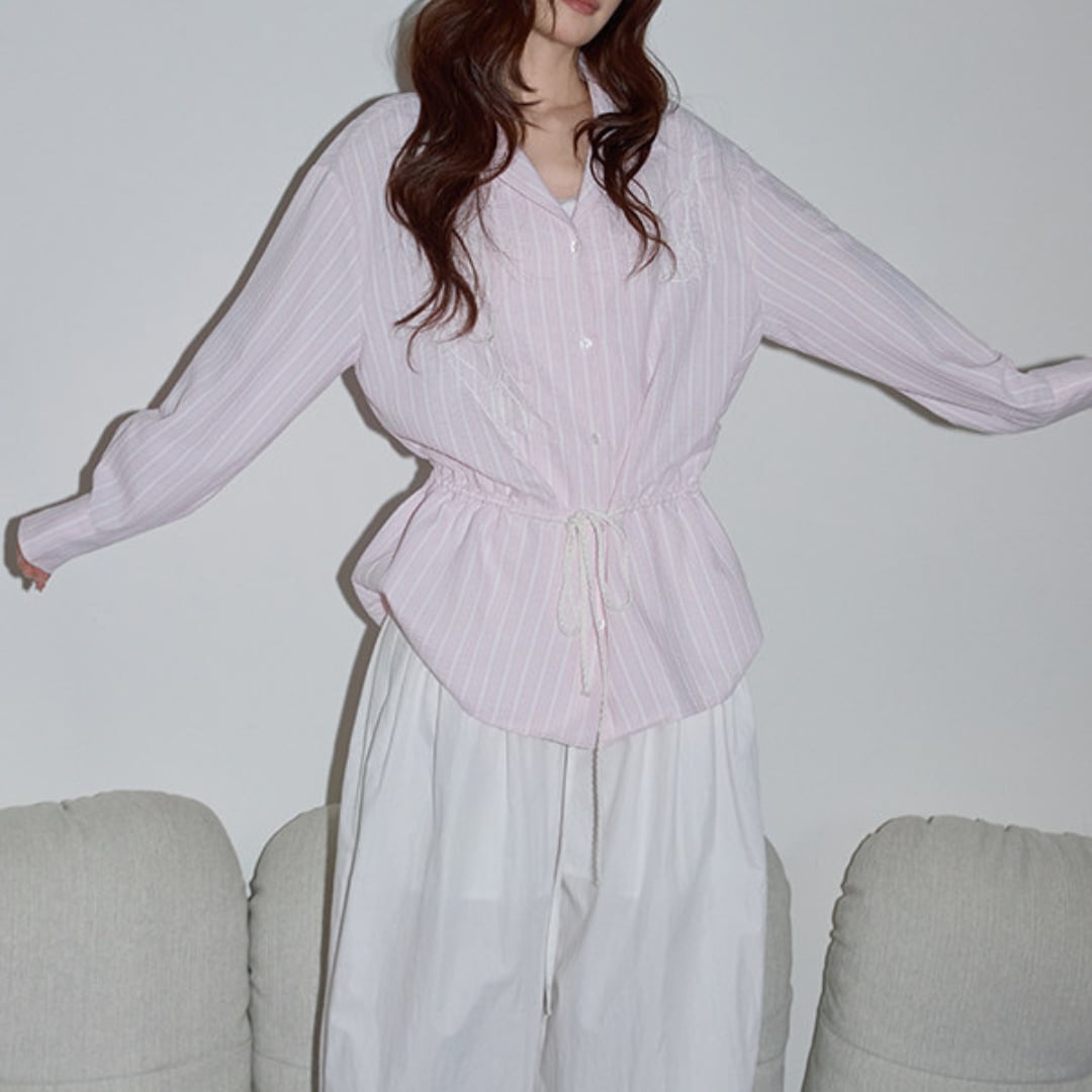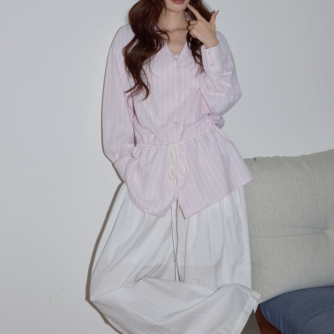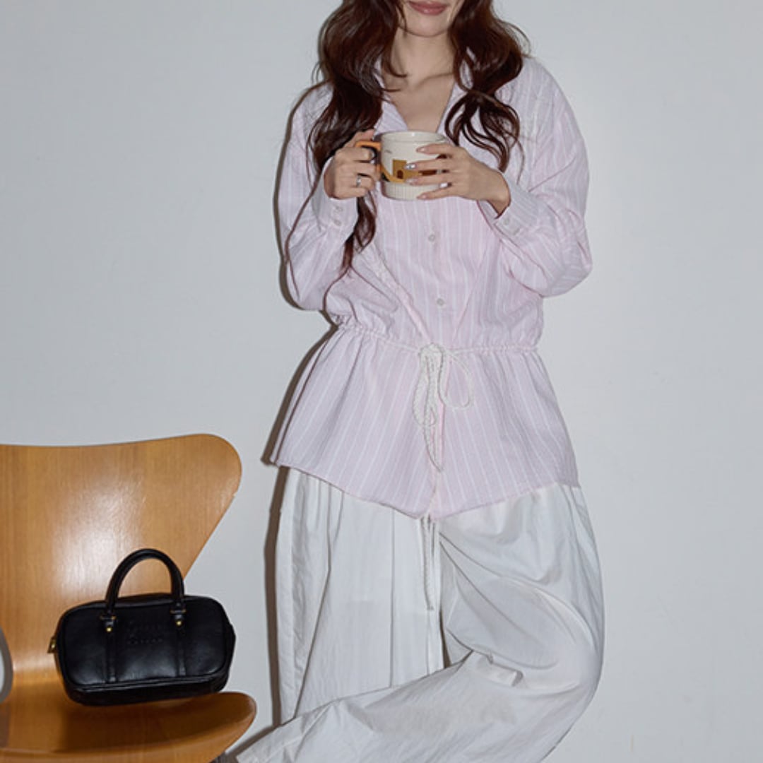 繊細なストライプ生地とウエストのドローストリングデザインが特徴の、やわらかく女性らしいシルエットを演出するシャツ。