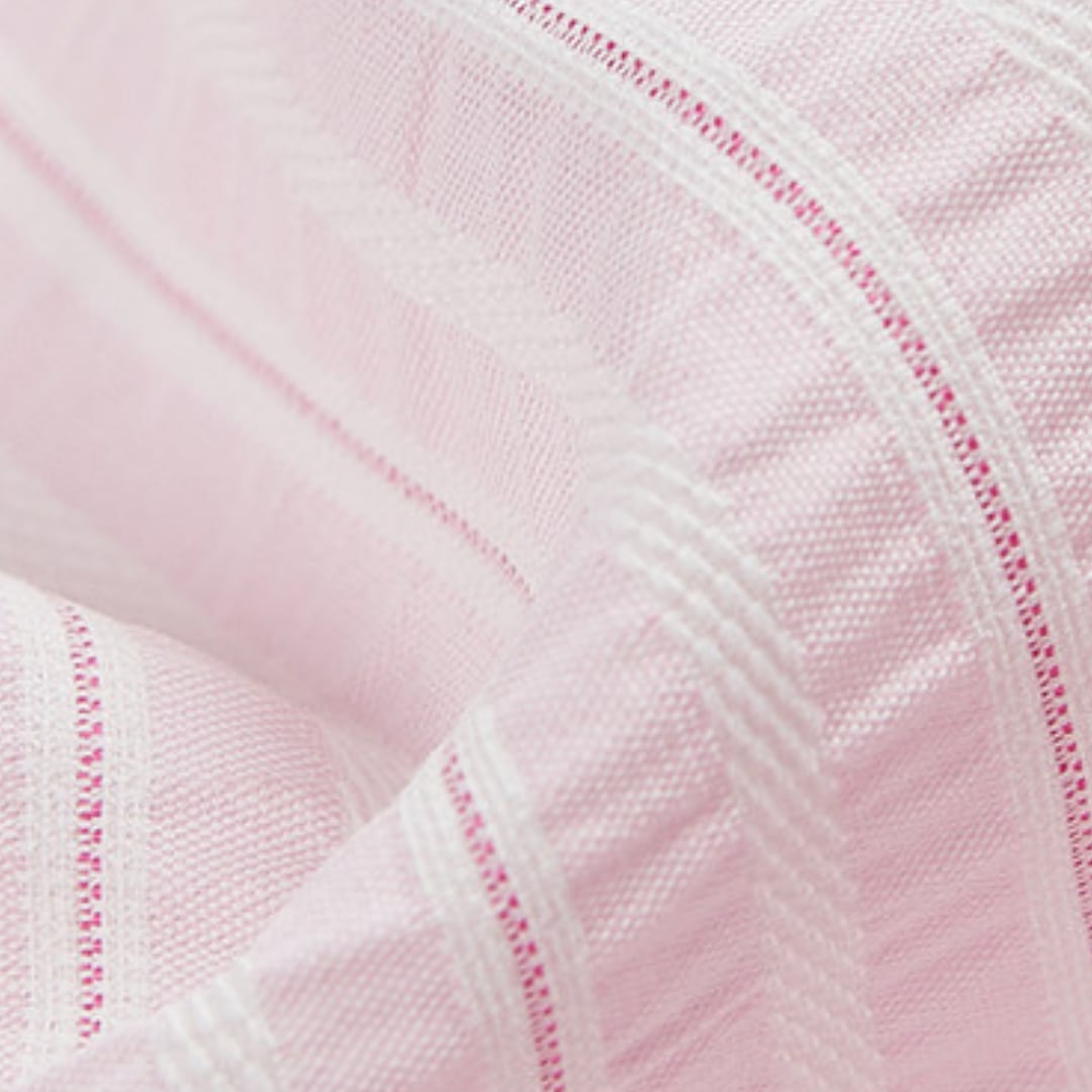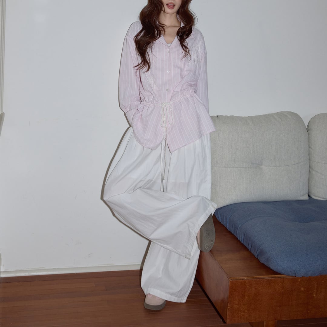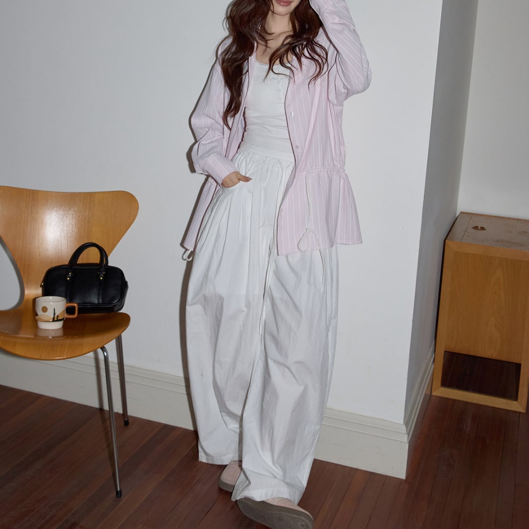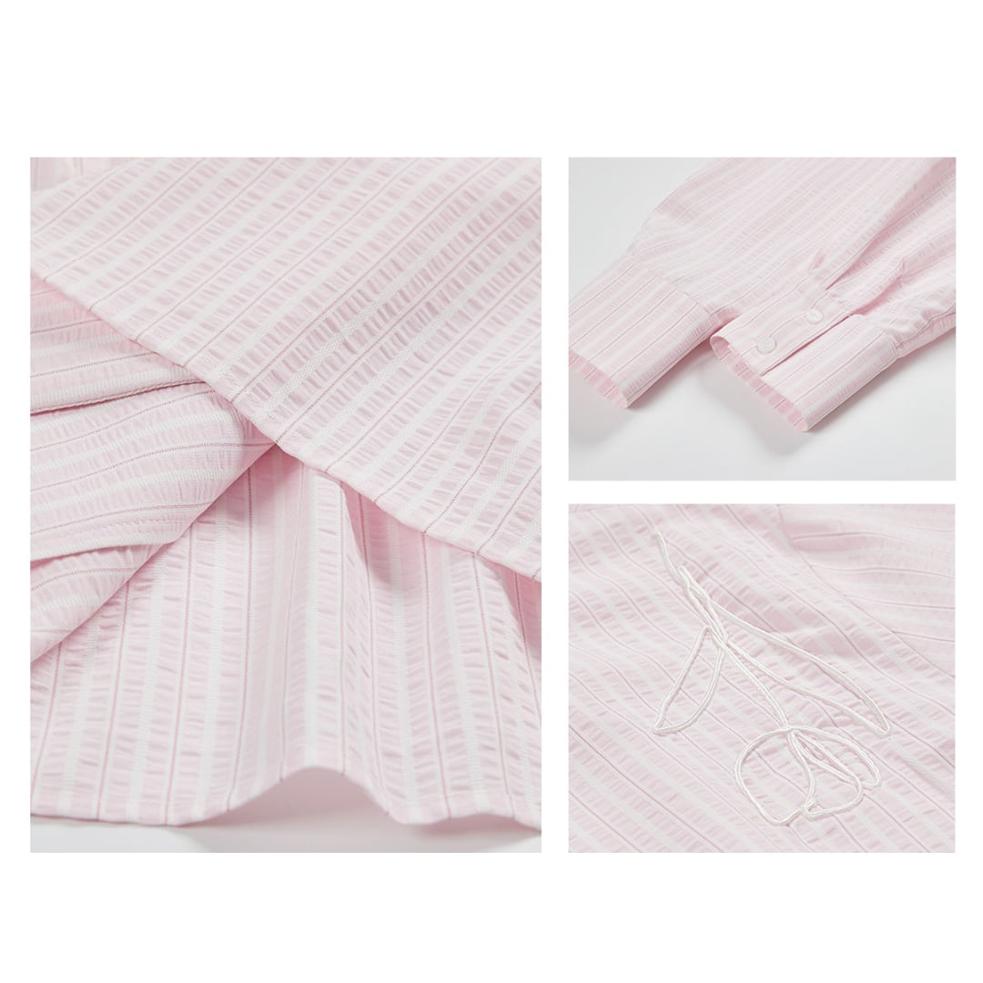 繊細なストライプ生地とウエストのドローストリングデザインが特徴の、やわらかく女性らしいシルエットを演出するシャツ。
