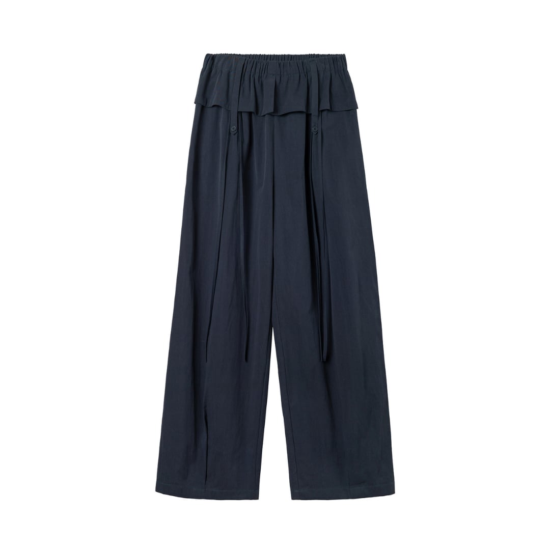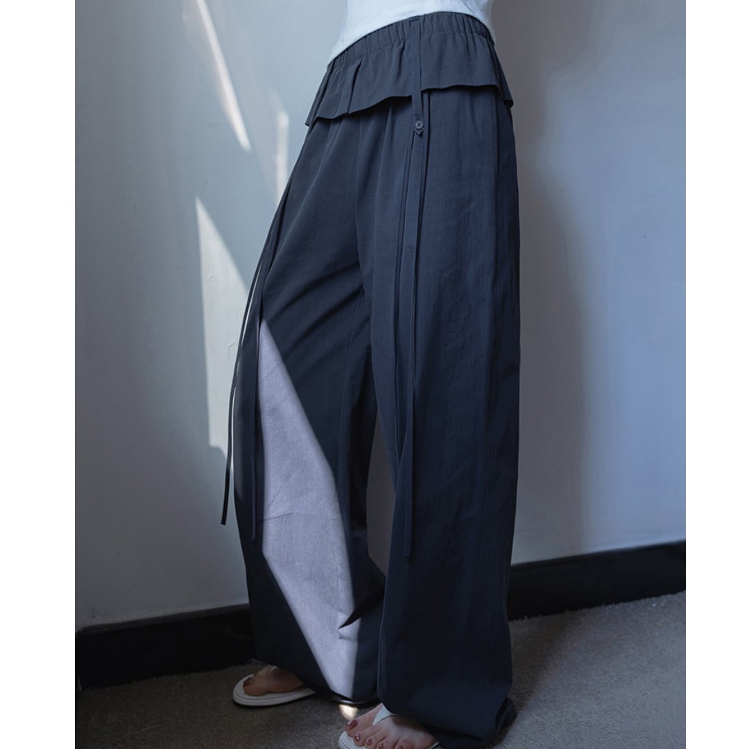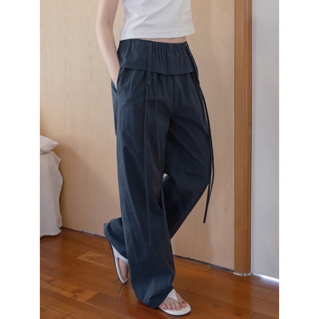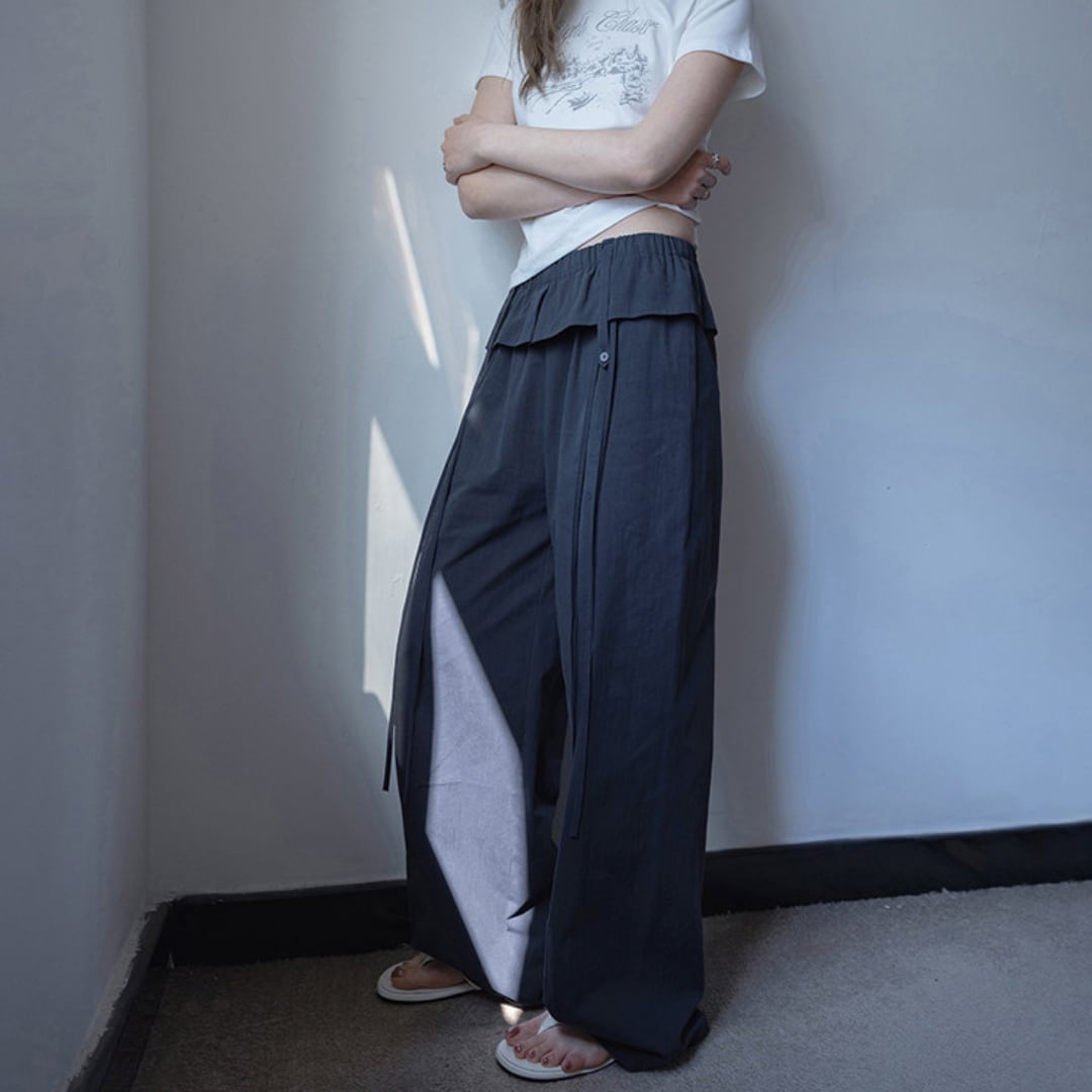 ウエストのドローストリングとゆったりとしたワイドシルエットが特徴の、リラックス感あふれるカジュアルパンツ。