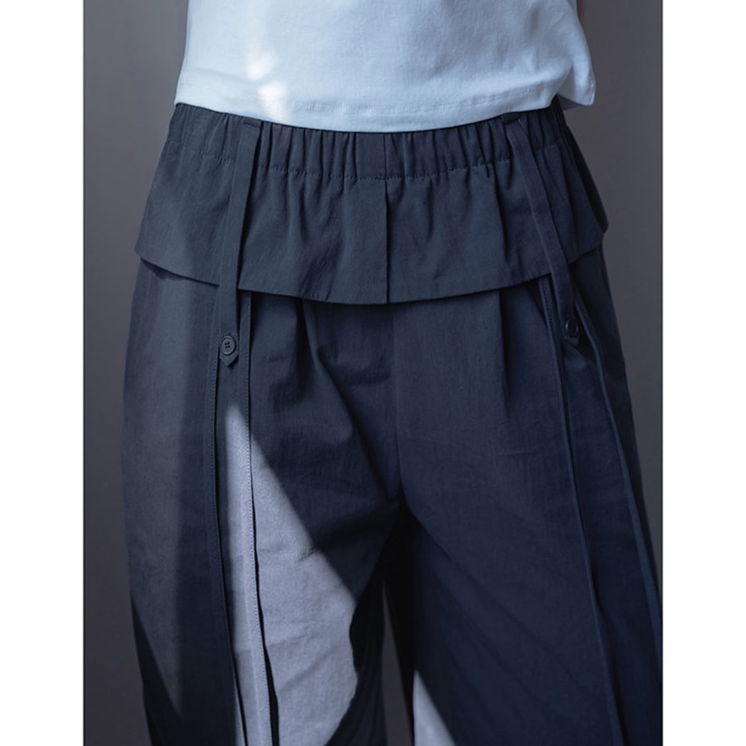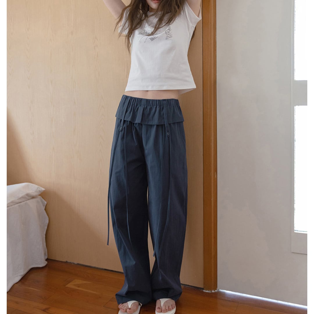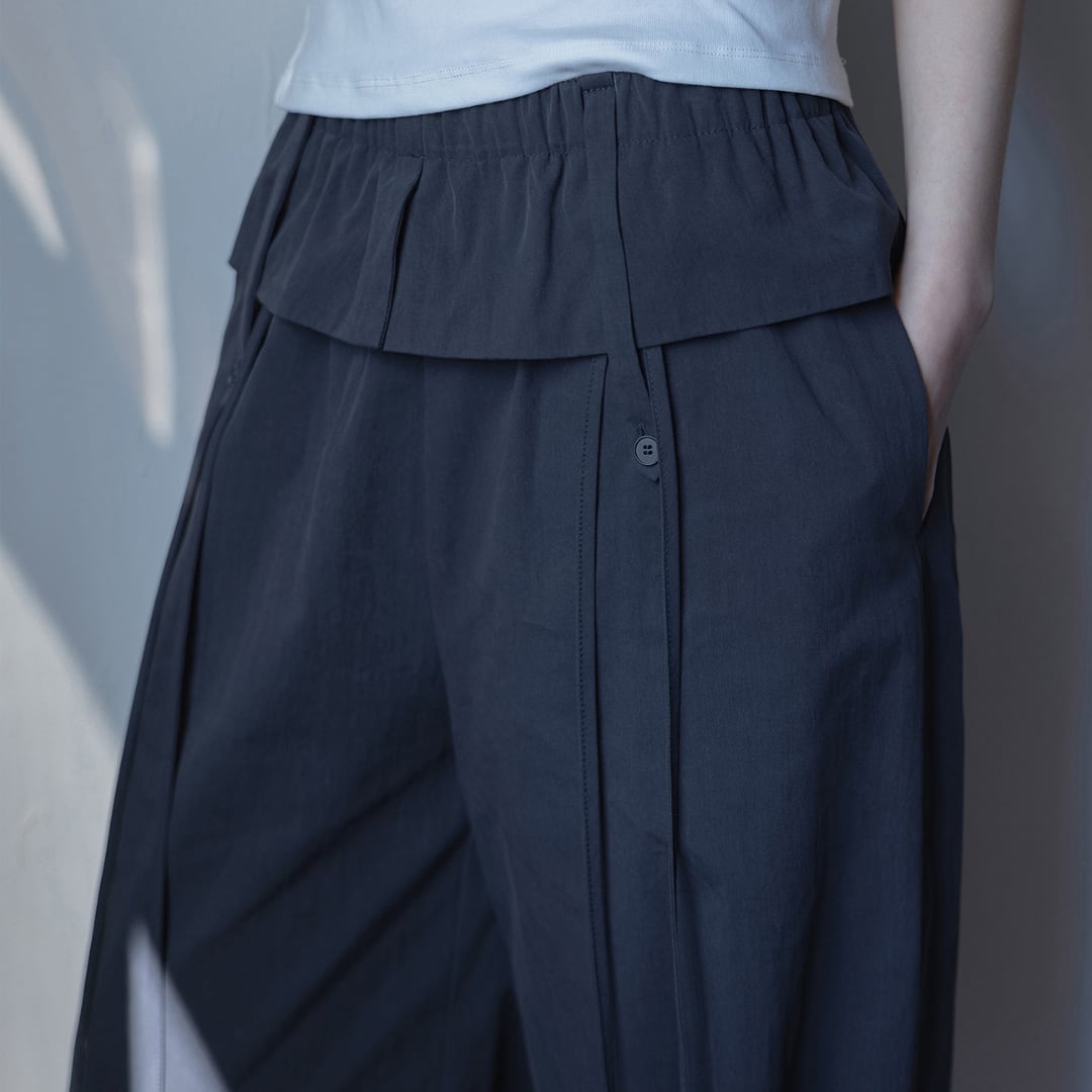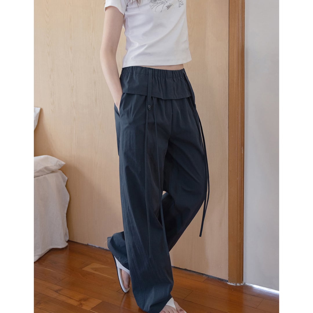 ウエストのドローストリングとゆったりとしたワイドシルエットが特徴の、リラックス感あふれるカジュアルパンツ。