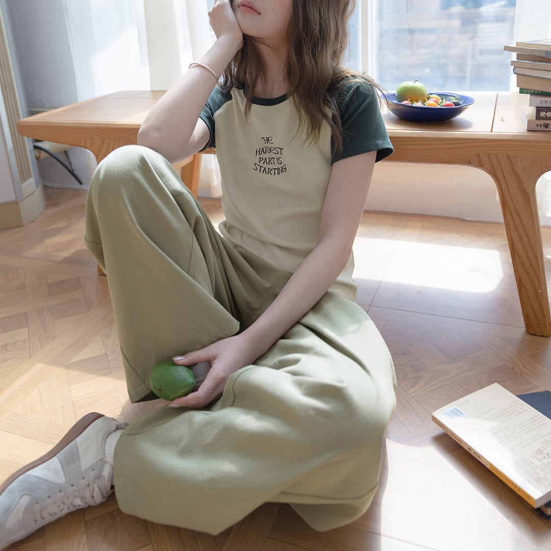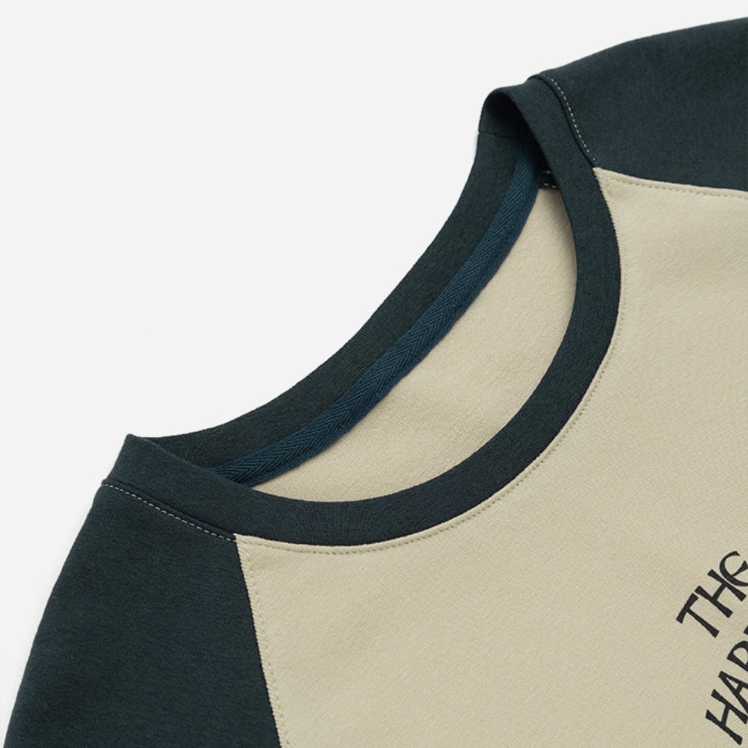 ラグランスリーブの切り替えデザインとフロントのロゴプリントがアクセントになった、すっきりとしたシルエットのカジュアルtシャツ。