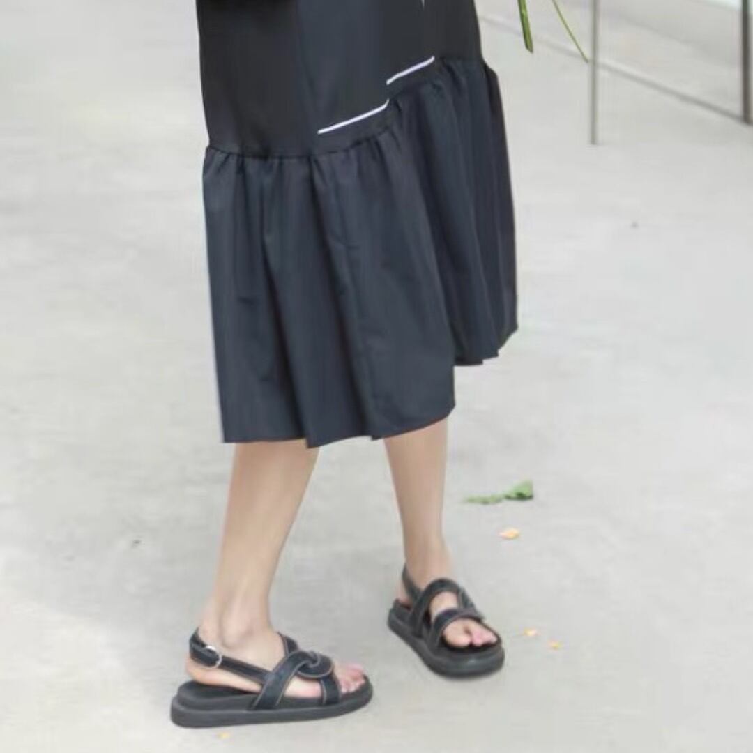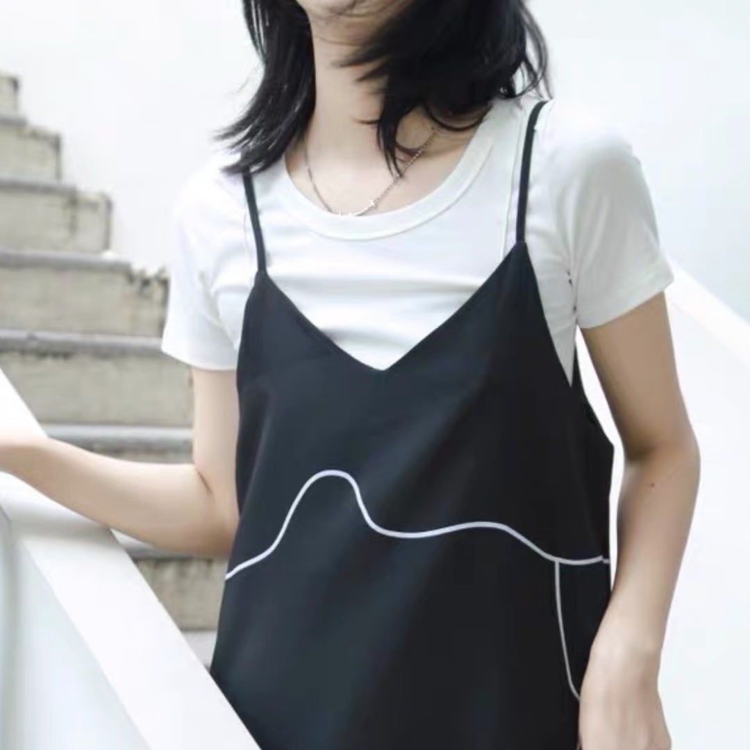 ブラック地に、ホワイトの曲線が映えるハイセンスなストラップワンピース。