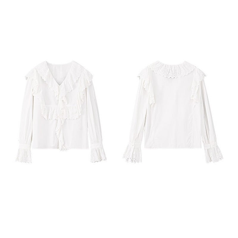アイレットレースをふんだんに使用した長袖ブラウス。Vネックで首回りをすっきり見せ装飾が多くても重くなりすぎないデザイン。これ1枚でレトロガーリーなスタイリングが完成する主役級トップスです!