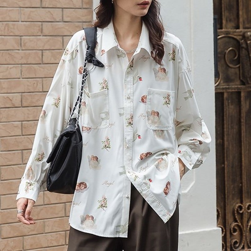 天使などのロマンティックなプリント入り長袖シャツ。パール風ボタンを使用し細かい所も気を抜かないキュートな1枚♡ドロップショルダーで柔らかな抜け感のあるスタイリングが楽しめます。