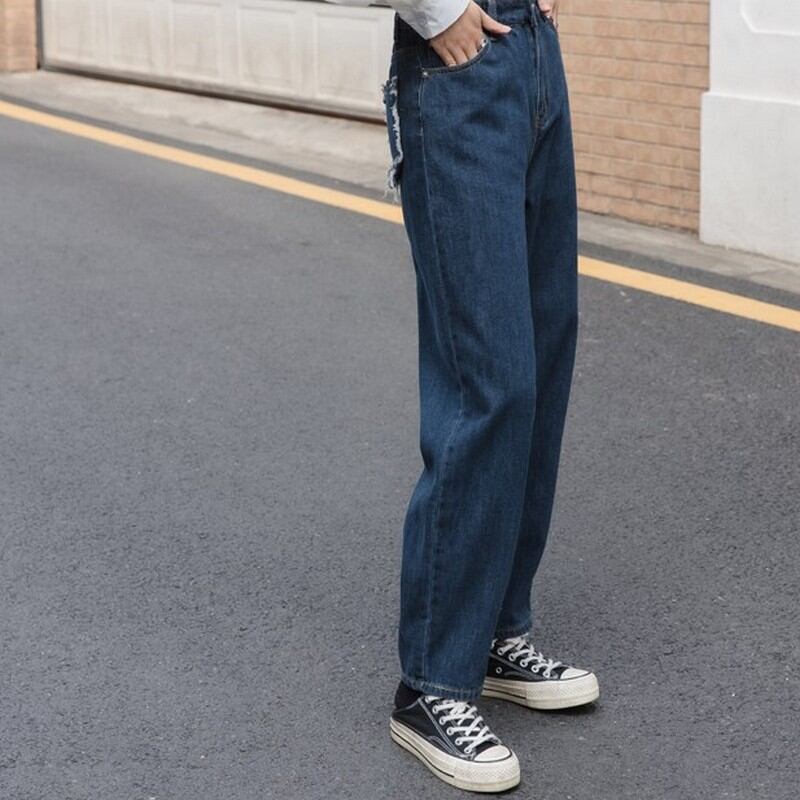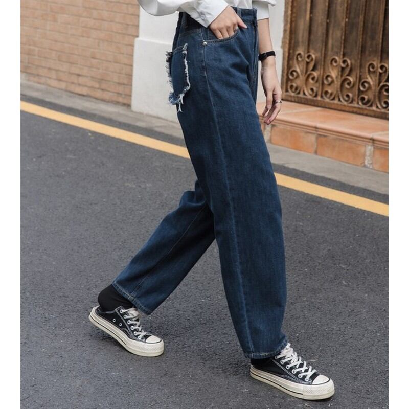 マムジーンズ風のデニムパンツ。切りっぱなし加工を施したバックポケットで個性をプラス。ストレートシルエットのすっきりと穿きこなせる1本。
