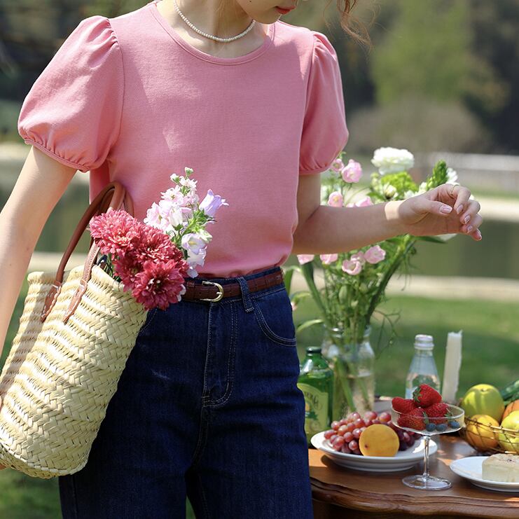 ふんわりとしたパフスリーブが可愛い半袖Tシャツ。お手持ちのネックレスも映える定番クルーネック。柄物のボトムスや羽織とも合わせやすい1枚です♪