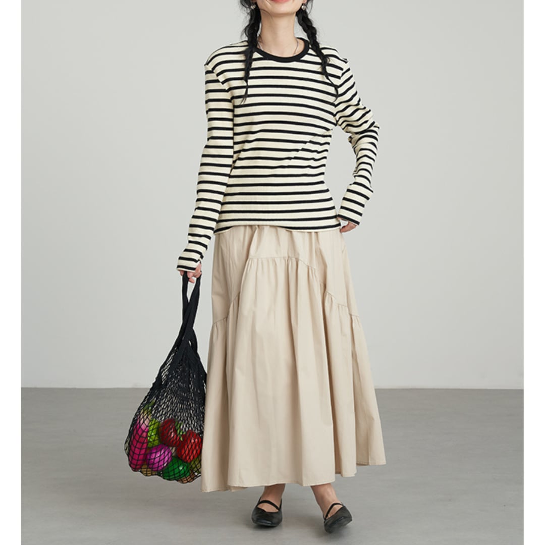 爽やかな印象を与えるシングストライプラウンドネック長袖Tシャツ。