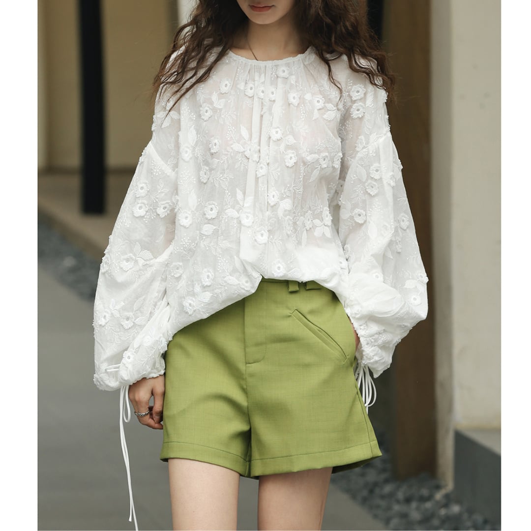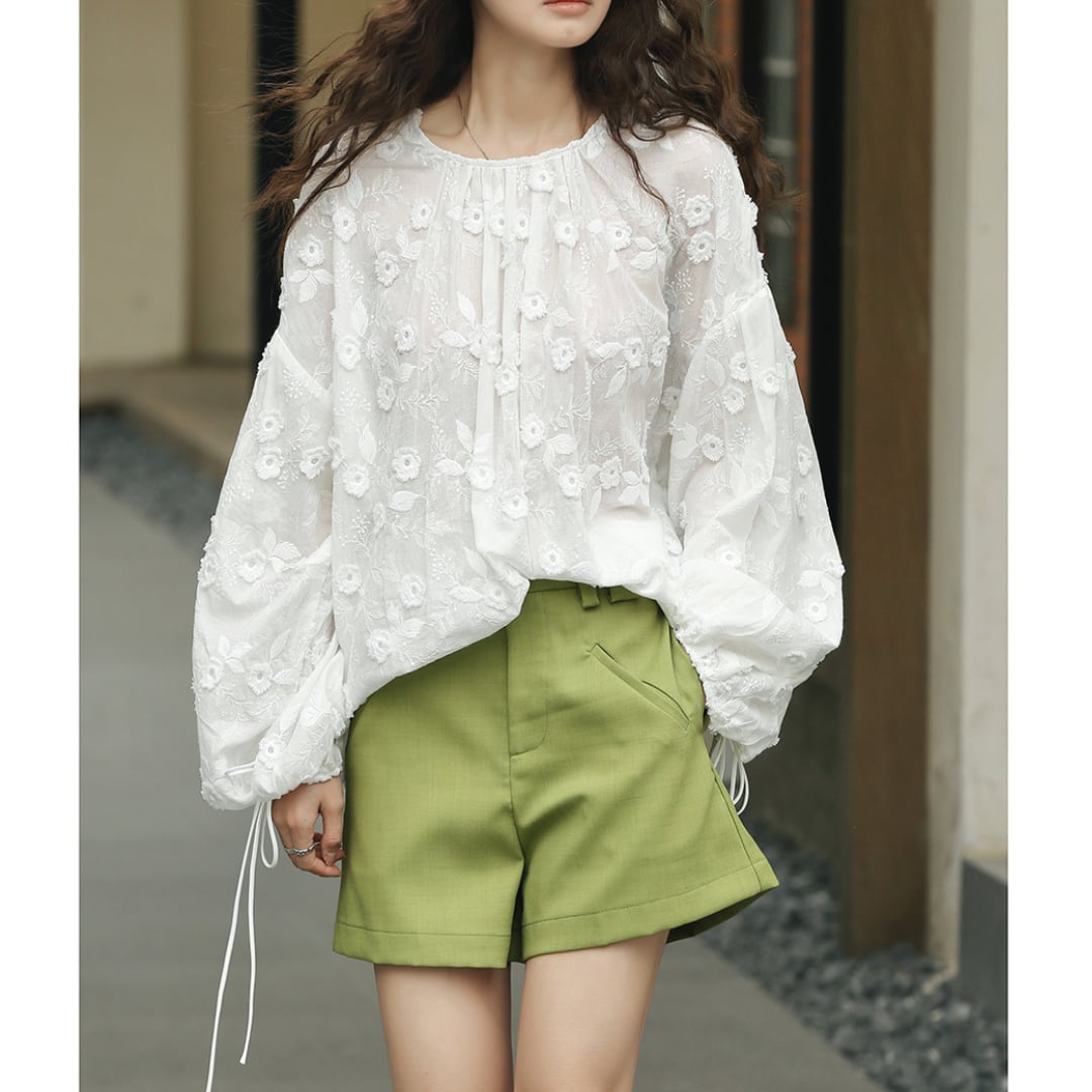 lantern sleeve round neck hook flower shirt