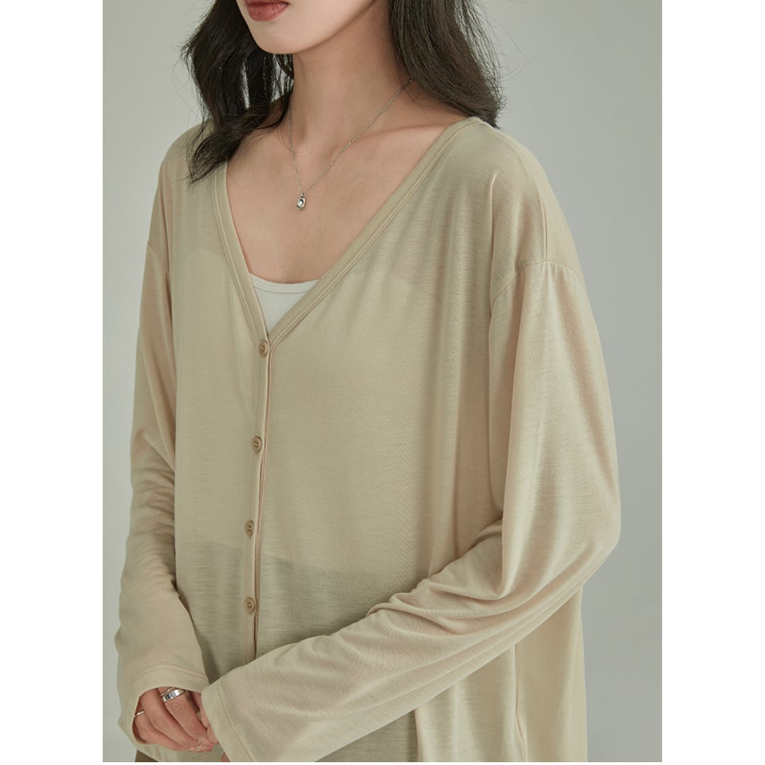 Vネックとカーキ色の組み合わせが大人っぽい雰囲気を演出してくれます。肌寒い日や冷房の効いた部屋で重宝するアイテムです。
