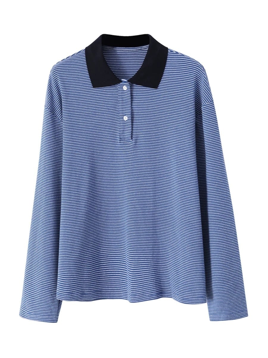 洗練されたデザインと着心地の良さが特徴です。ボートネックのラペルが首元を美しく演出し、ブルーストライプ柄がシンプルながらもおしゃれな印象を与えます。普段使いからカジュアルオフィスまで幅広く活躍する一着です。
