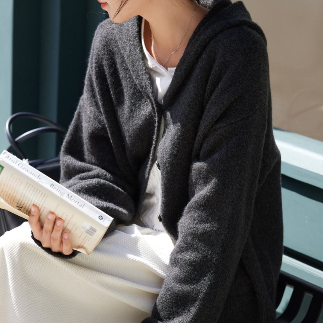 ビッグカーディガンは、ゆったりとしたシルエットとフードが可愛らさを演出します。