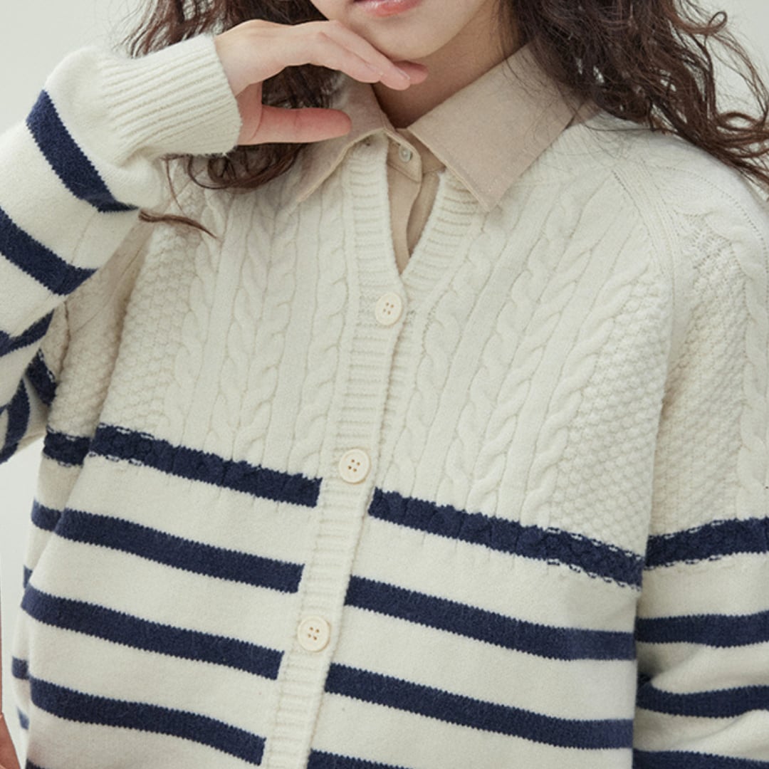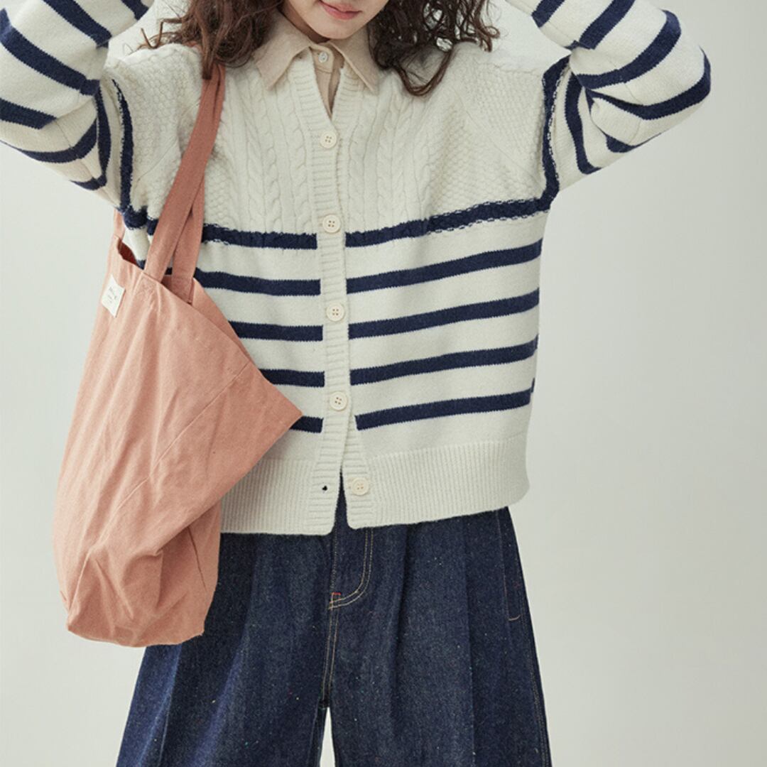 カジュアルな日常から特別なシーンまで、幅広くご活用いただけるストライプツイストニットセーターカーディガンは、オシャレなストライプ柄が存在感を放ち、トレンド感をプラスします。