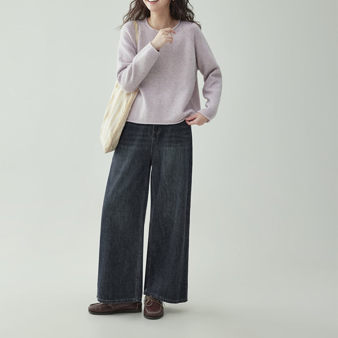 洗練されたデザインと心地よい触感が魅力の無地ロールエッジラグランスリーブウールセーター。シンプルながらもスタイリッシュな一着です。