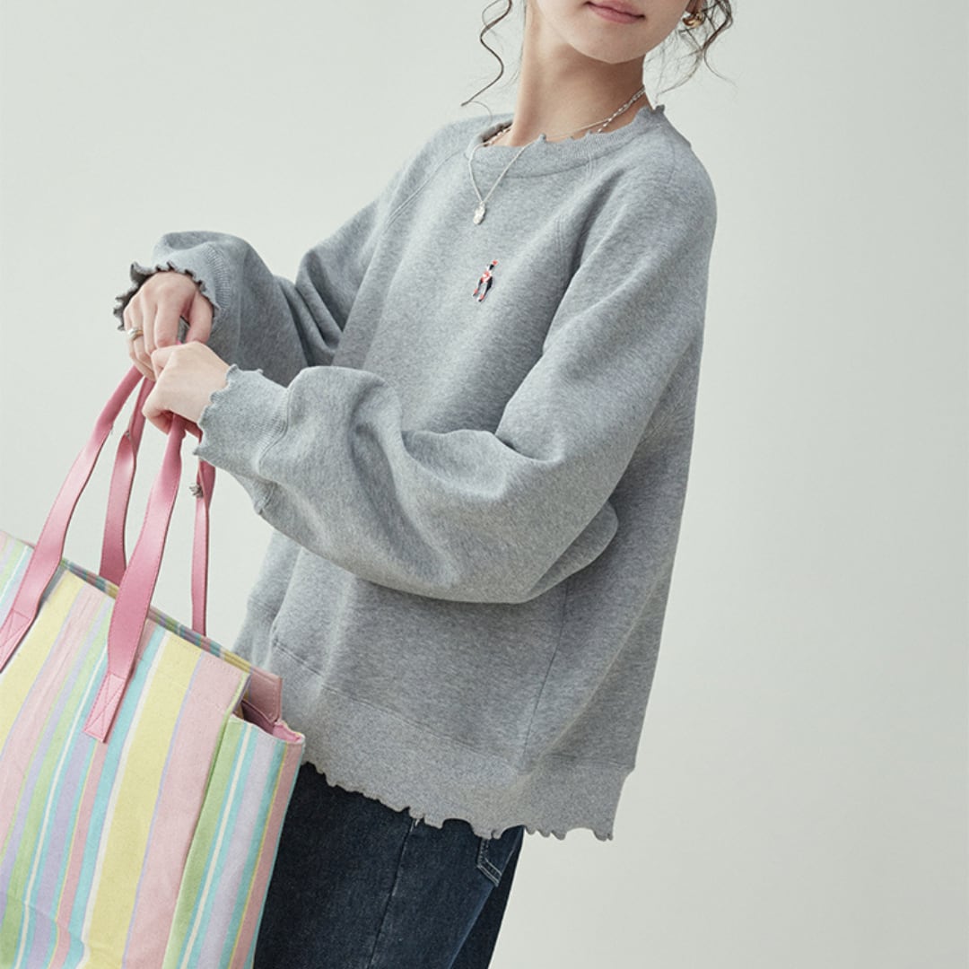 シンプルでありながら、洗練された印象を与えるグレー刺繍ラウンドネックトレーナーです。