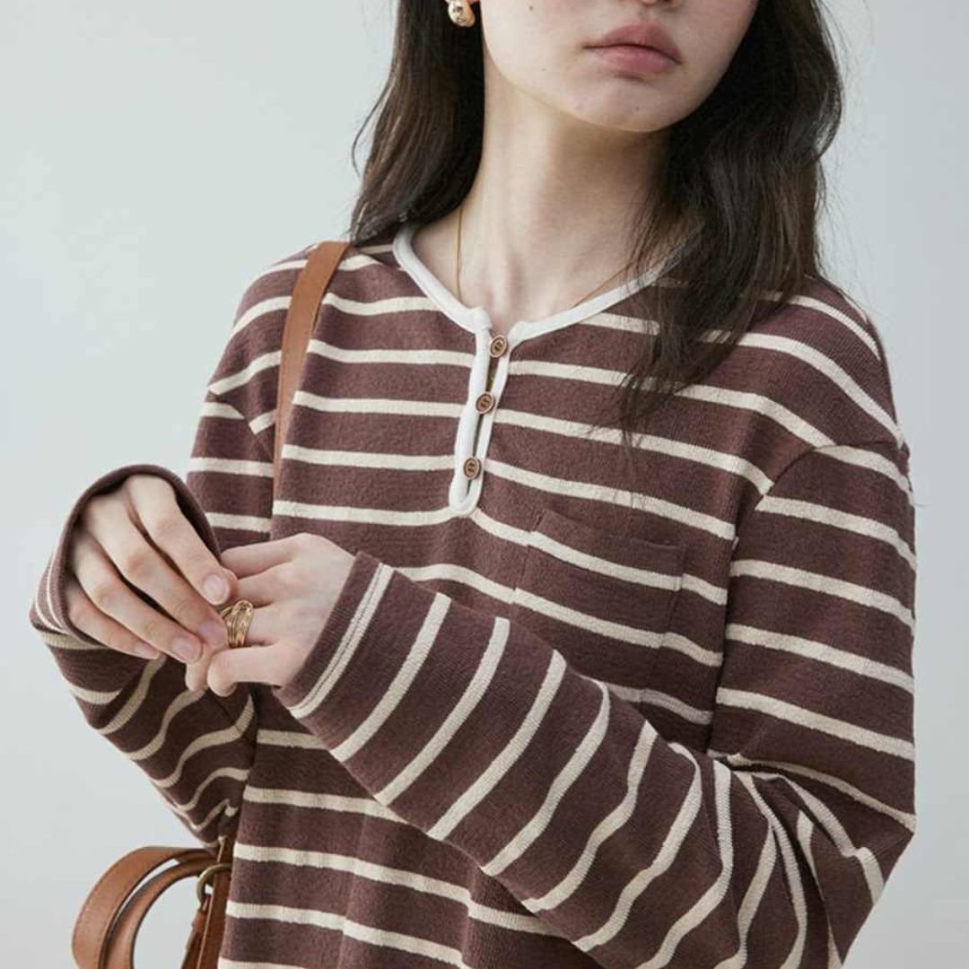 ルーズなシルエットと、ブラウンボーダーが、レトロな雰囲気を演出します◎
