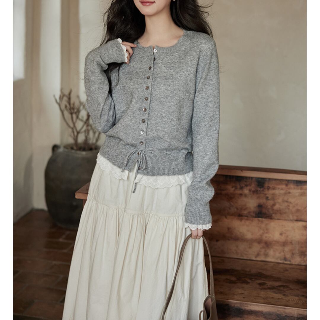 シンプルさとエレガンスを兼ね備えたカーディガンです。柔らかいグレーの生地に施されたレースが、女性らしさを引き立て、着る人を美しく見せます。