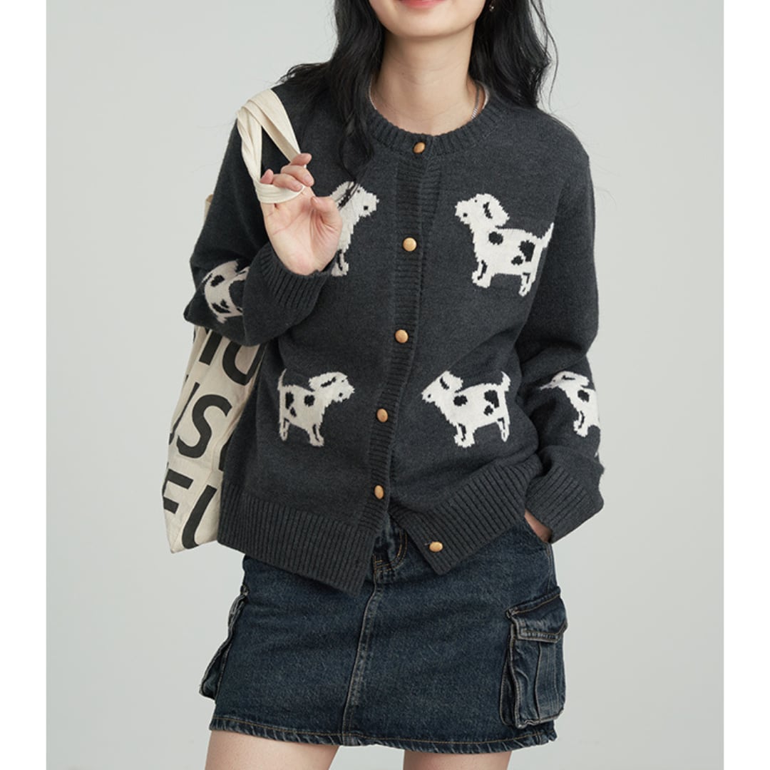 ポップで遊び心あるワンちゃんニットカーディガン。